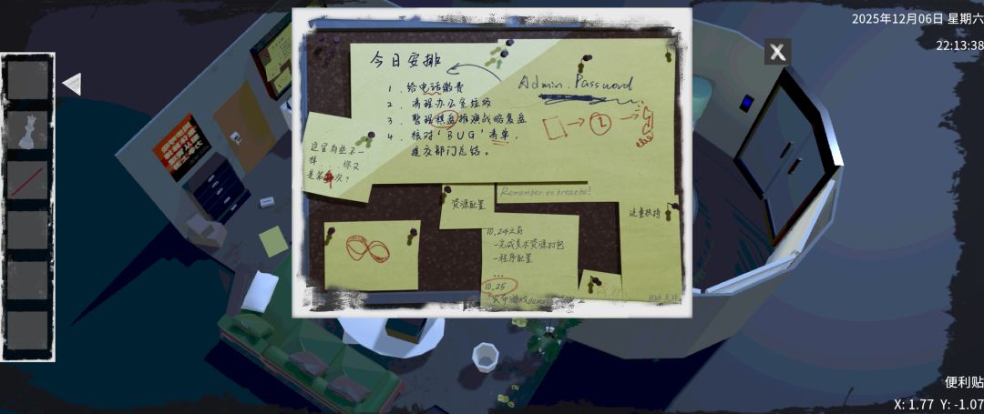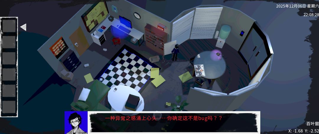 3D解谜类游戏,固定摄像机视角,俯瞰状态下整个房间一览无余。键鼠同时操作,线索需要主角靠近后才能触发搜索,找到线索并不难,难点在于如何利用现有线索来破解谜题。作者脑洞有点大,线索如何联系起来形成谜题答案非常烧脑。有基础操作介绍,内容并不复杂,摸索一下也能很快上手。