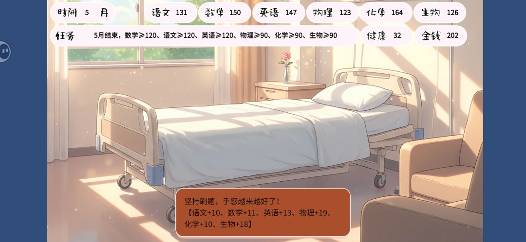 什么叫渐行渐远?你到底落下了多少节语文课?告诉我,你到底有没有上过语文课?😅主角随着玩家的选择分数慢慢上升,没达到你的预期,真是抱歉,但是离你的目标分数很近了,你告诉我,这叫渐行渐远?😅一个高中生,两个月以内你300分没有达到你最初标准的420多(文本434)😅,后两个月没达到你的540多(文本512)😅,在以至于后来的630多(文本645)😅,每个节点只要没达到都会死掉是吗?都要重来的,没达到,就是原罪,接下来的生活就不过了,一切要按照你理想的预期进行是吗?随机提升数值恶心玩家?还是锁定每科一定要达到多少的?主科以外的副科都可以破100分的了。你随机数值给了,然后月测得分和文本分不一样,你有在笑吗?。难道所有人的进步,都像坐标系里面的x=y的图像吗?😅合理吗?你本身就是庸才,那如果靠努力就能直现飞跃,那世上还有努力的差生吗?😅