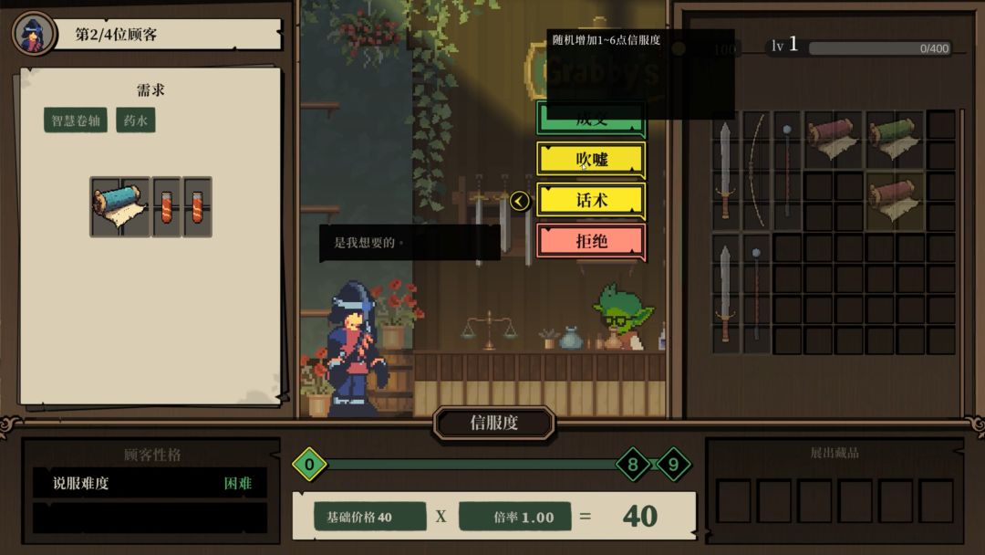 从地下城进完货,接下来就是把搜到的东西销售出去,这里会用到两个选项,一个吹嘘、一个是话术,吹嘘的玩法是类似21点,维克对货物的吹嘘以投骰子的形式显示,累计投出的点数刚好在绿色区间,就算成功,卖出高价,当然对于贪婪的人可以选择更进一步,比如卖出双倍,依旧是投点数,如果炸了对方反而会提出折扣要求,要如何抉择就要看玩家了。还有一些客人是比较精明,除了需求高外,也很难说服。