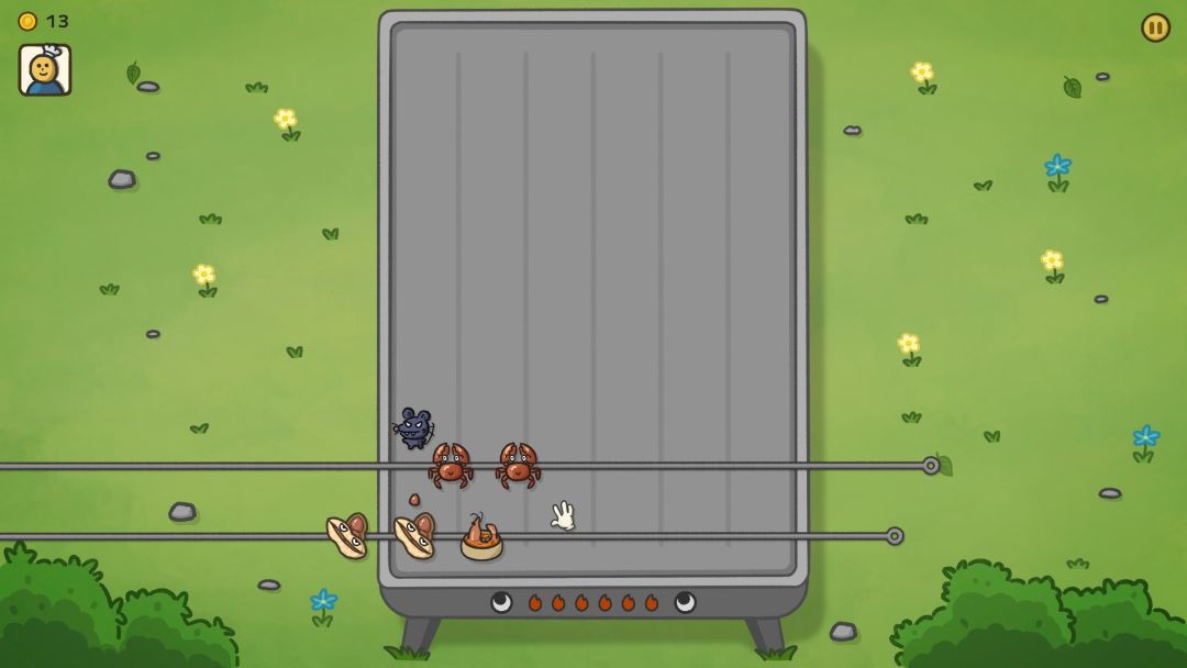 游戏的主要玩法是塔防,以一个有6个竖行的烧烤槽为地图,横向的烤签上只能串入三个食材,但有三个烤签,可以通过点击选中后左右进行移动,这样烤签上固定的食材就能在同的烧烤槽跟换位置。