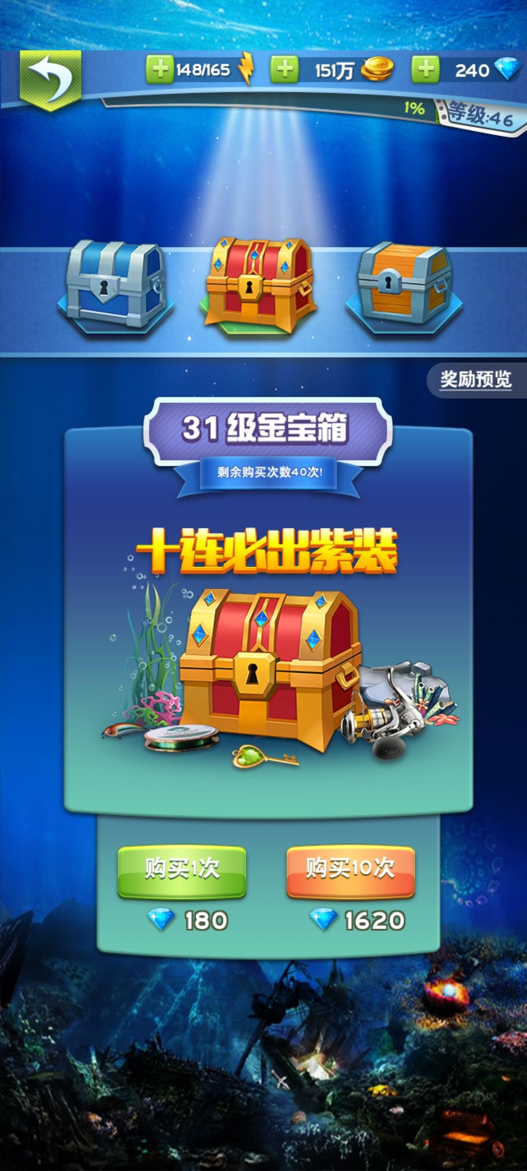 复活节的肩饰石斑鱼钓不上来,随便就跑出500米远鱼还有接近一半血条。箱子46级了还是31级宝箱(46级是最后一个阶段的高级宝箱)。
