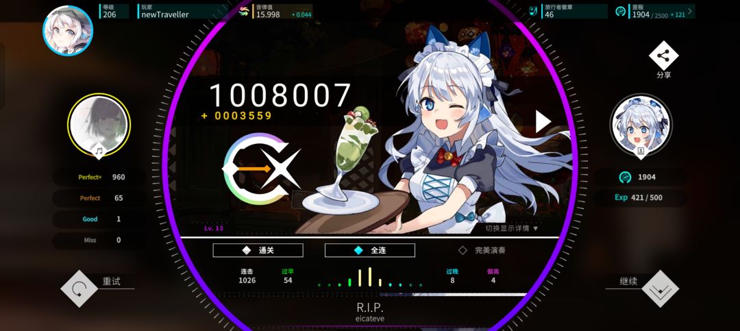 这个游戏主要的核心玩法还是陀螺仪,游戏制作组还是比较用心的陀螺仪的准度很高,以至于让我体验到了 “开车” 的感觉”(๑•̀ㅂ•́)و✧,还有按键的震动和音效,让我感受到了莫名的“ 高级” 感,这个游戏的判定还是比较宽松的,只要没断,就能算全连,还有理论值,结算就是下面那个彩色的 “x加C” ,结算页面还是比较帅的,成就感满满啊 (。ò ∀ ó。)