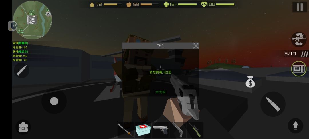 第6点就是这个游戏完成度还是有一点差,但没有基本的新手指引,并且剧情是不完整的,我是基本上打完了第二个海滨城市的图,我才知道可以去营地升级武器和买东西,营地有人,刚去营地的时候我看着站了几个人,我还打了好几枪,我还以为是boss,因为打的没伤害,之后像三图一样在机场顶端刷新了一个要本杰明的NPC,可以点击带我离开的选项,但是点了之后并没有任何用