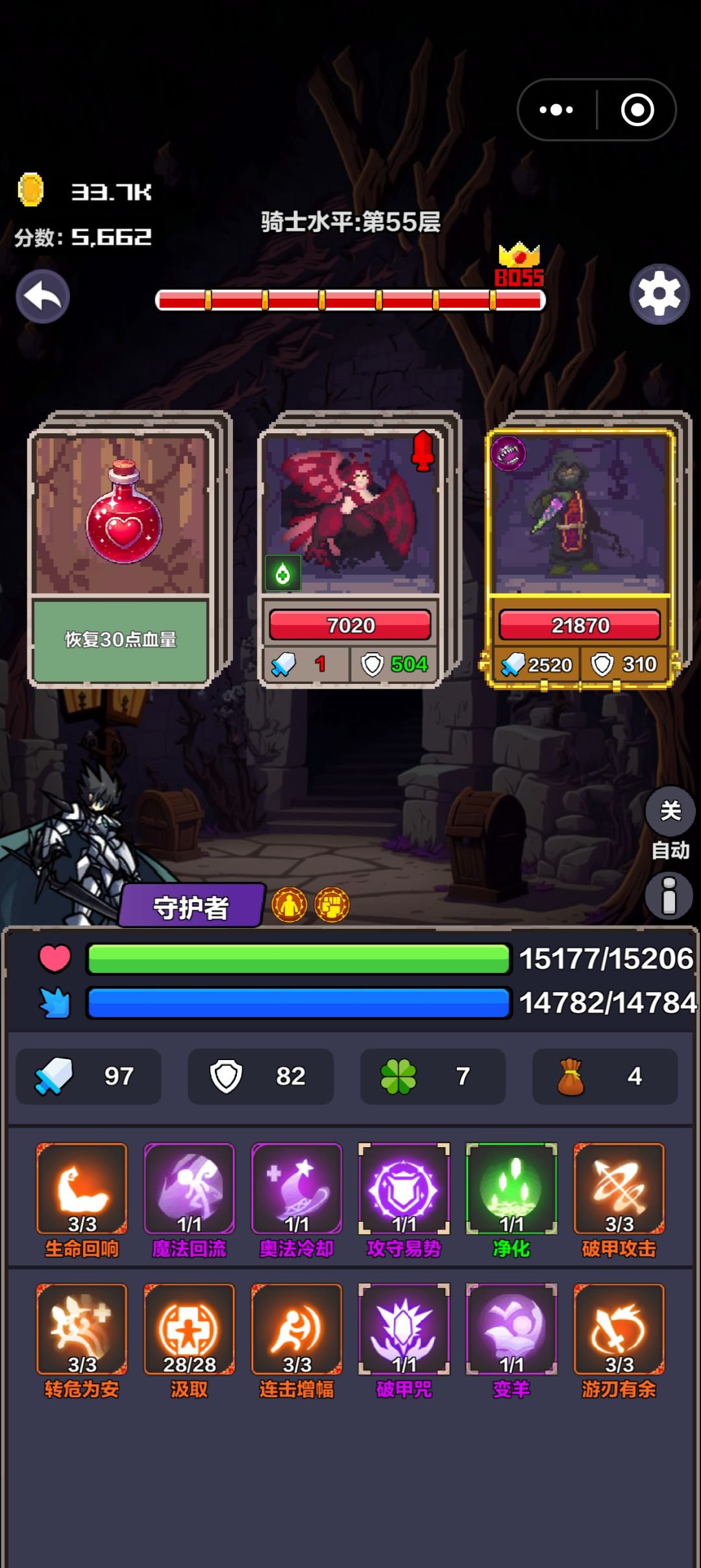 战斗思路,每层找个红鸟,技能全部回血,打其它怪她回血会提高自己血量上限(每层血量上限不一样),达到上限后,攻守易势红鸟,接下来正常打其它怪,每回合受击1血,忽略不计。碰见禁疗的boss,没血就打红鸟回血。打boss阶段,变羊,破甲咒,打一下,攻守易势,破甲咒好了就用,没血就打鸟。