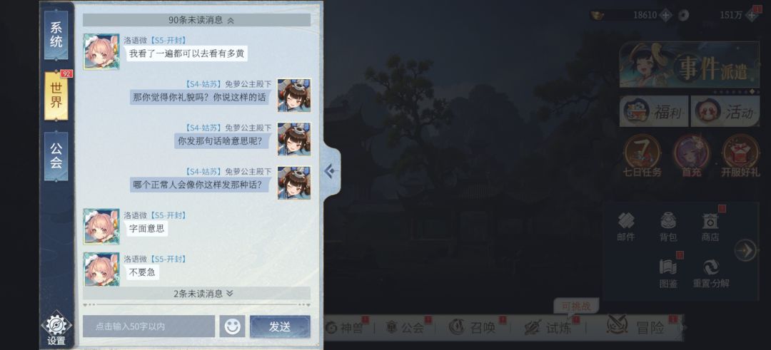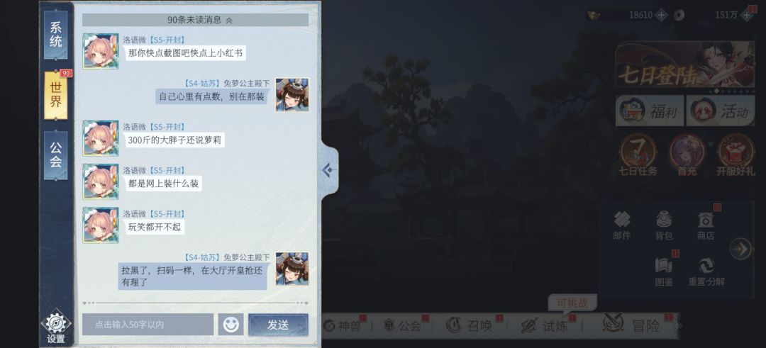 在游戏世界频道正常发布公会“九天萝莉圣殿”招募信息时,玩家沐星珞(S4-姑苏)突然发布“来玩你吗”的低俗黄腔言论,被质疑后又以小号洛语微(S5-开封)继续纠缠,不仅以“开玩笑”为借口推脱,还对我进行人身攻击、嘲讽“开不起玩笑”。其在公共频道公然开黄腔、恶意辱骂他人的行为,严重污染游戏环境。我虽有反击,但这种在公共场合发布低俗言论还引以为傲的态度,实在让人气愤,希望大家能关注此事,共同抵制游戏内的低俗冒犯行为。