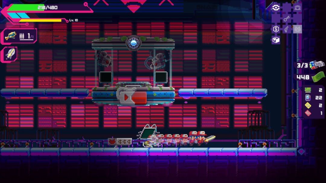 不是,你有见过这么离谱且解压的赛博肉鸽吗?这游戏虽说名字带黑客,但核心体验还是更加偏向于硬核动作,游戏每个关卡的目标是就是找到BOSS的房间并将其击杀,而想要找到这个房间可不是那么简单,密密麻麻大小不一的房间都散布在整个地图中,房间之间有相互连通甚至有的房间连接了不只有一个房间,房间的种类也会出现不同的变化,有可以将收集的物资传送回大本营的运输房,也有挑战获取大量资源的挑战房,当然还有猫猫被囚禁的房间,这肯定是我一定要去拯救的。