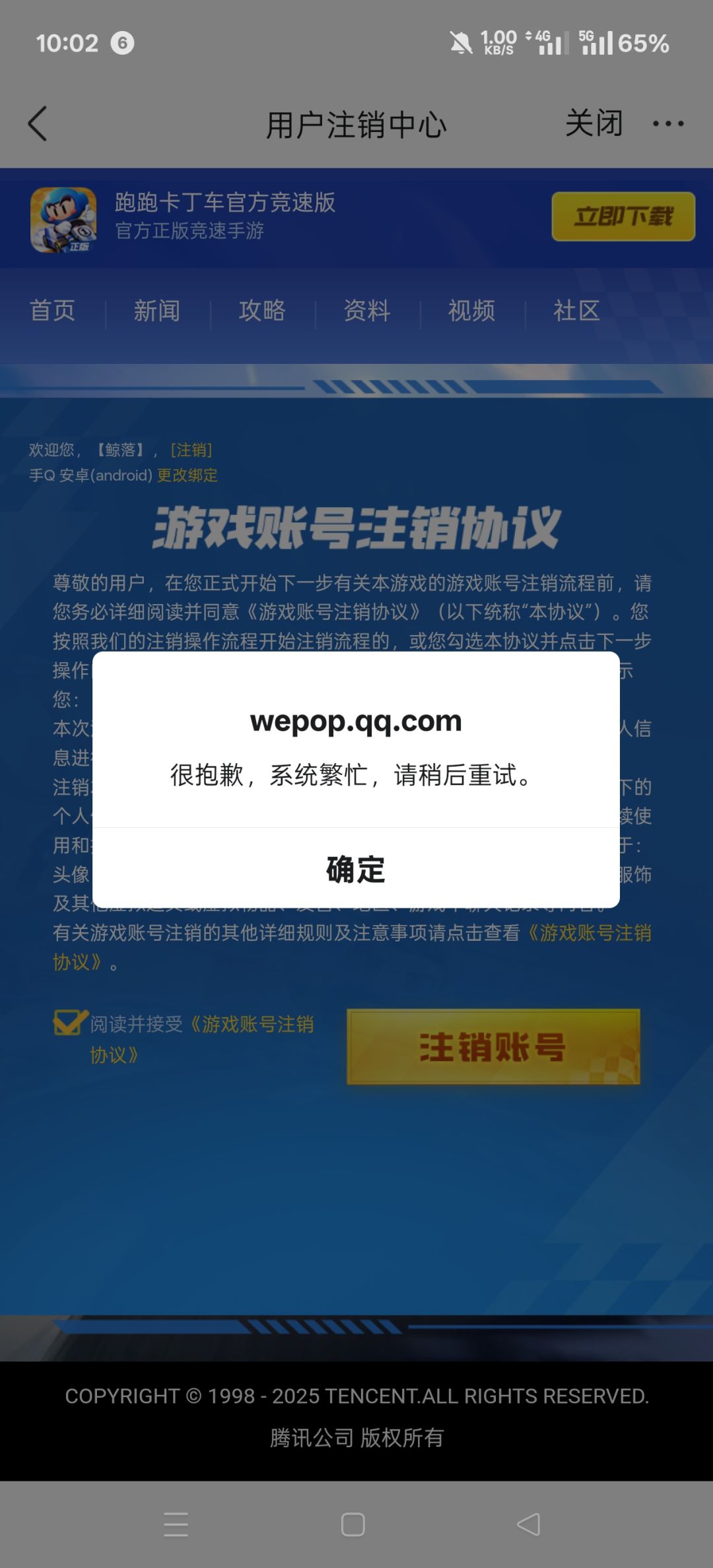第一次玩,没怎么玩,发现手感不太行,所以想注销,没打算以后玩,所以直接注销,结果多次注销,显示系统繁忙😅