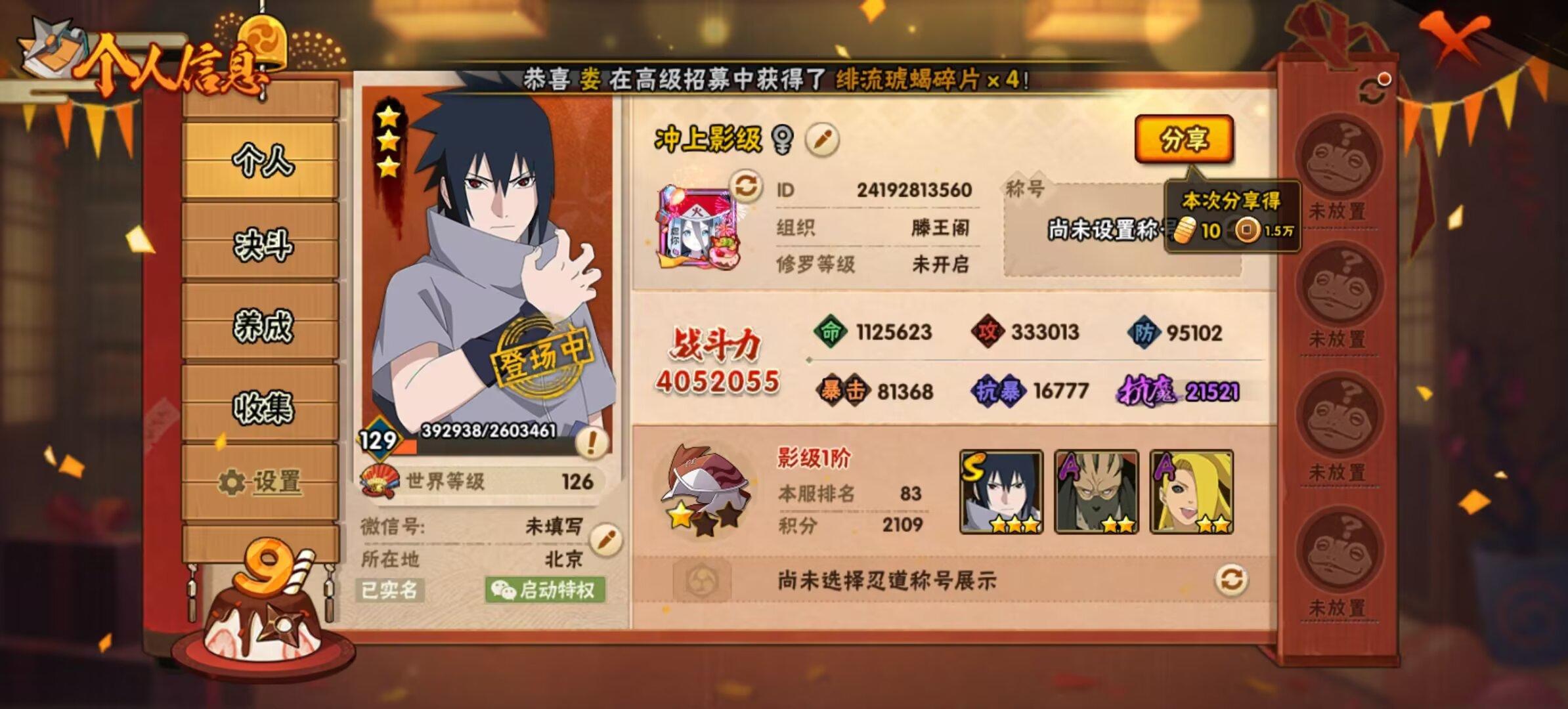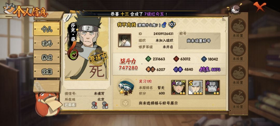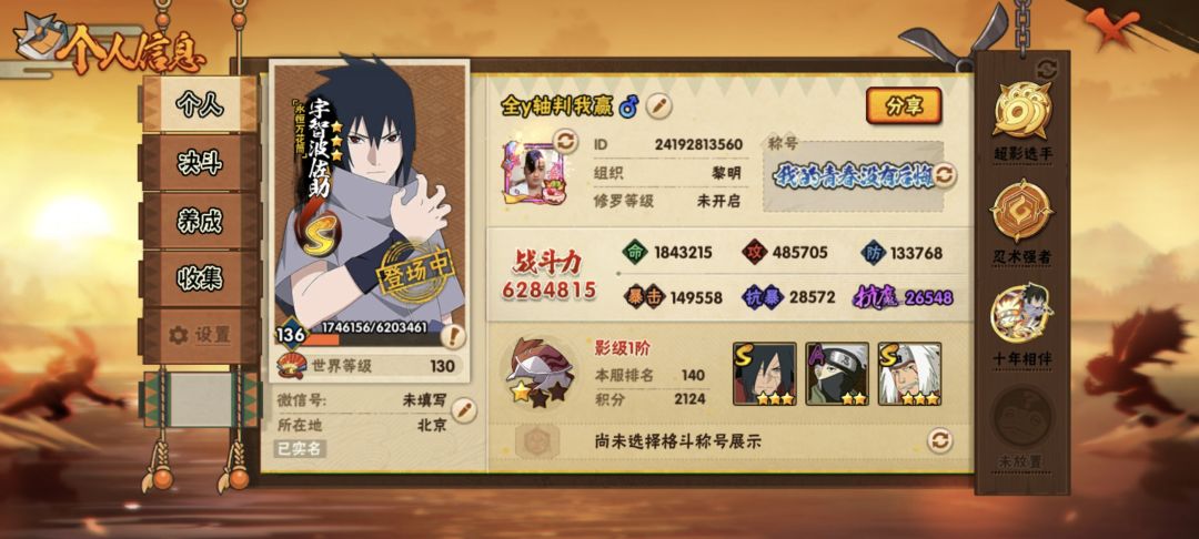 一转眼这个号我已经快玩两年了!这个号是我玩过最长时间的号了!我是从金鸣上线开始玩的当时觉得很无聊我记得我玩的第一个s忍者是自来也然后其他的我也忘了然后就删了等到木叶丸那个高招上线我就又开始玩火影了那时候好像才五六年级到现在我已经高一了。之前每天回家天天拿我妈手机玩火影当时很菜班里就我一个打火影的当时还拉拢我朋友一起下火影玩!当时不会玩以为高招能有概率中整卡A和S天天抽高招到了后来才知道是不会中的!等到上了初中就慢慢开始有点淡游了不能说是淡游了只能说没时间玩!等到初二上半年我和同学晚自习看白板看到了有一个主播炫酷的秽土迪达拉操作我就和我旁边玩火影的同学说要不要等到放寒假创个信号一起肝,他说可以于是我们就在2024年的1月26日的世界进了区(也就是我现在玩的号)。那时候他肝骨架我肝死迪每天天天单挑度过了一个比较快乐的寒假!等到开学不知道是什么时候漂泊君麻吕上线技能爆料当时技能爆料非常炸裂我和我同学在学校白板看见非常兴奋!但那是是住校只能干瞪眼!等到放假我开始算活动什么时候结束最后我算出来是满打满算还差一天我记得当时挺绝望的!但那是有主播反映活动又延期了!送A忍活动我给我妈说好话让我妈帮我签到拿A时候觉得自己很聪明没想到活动又延期了!反正这么多就是想表面我很喜欢这款游戏祝火影忍者手游蒸蒸日上十周年快乐!(前二张是我在不同世界截的游戏内的图三张是我小学玩的账号)