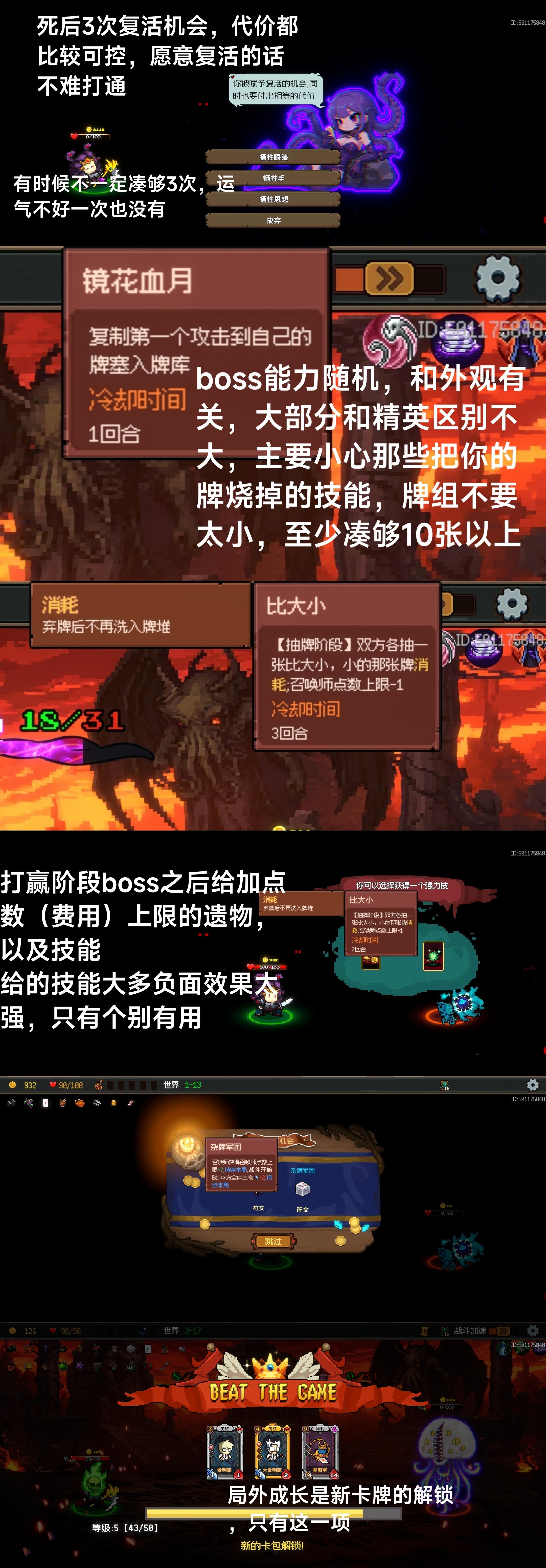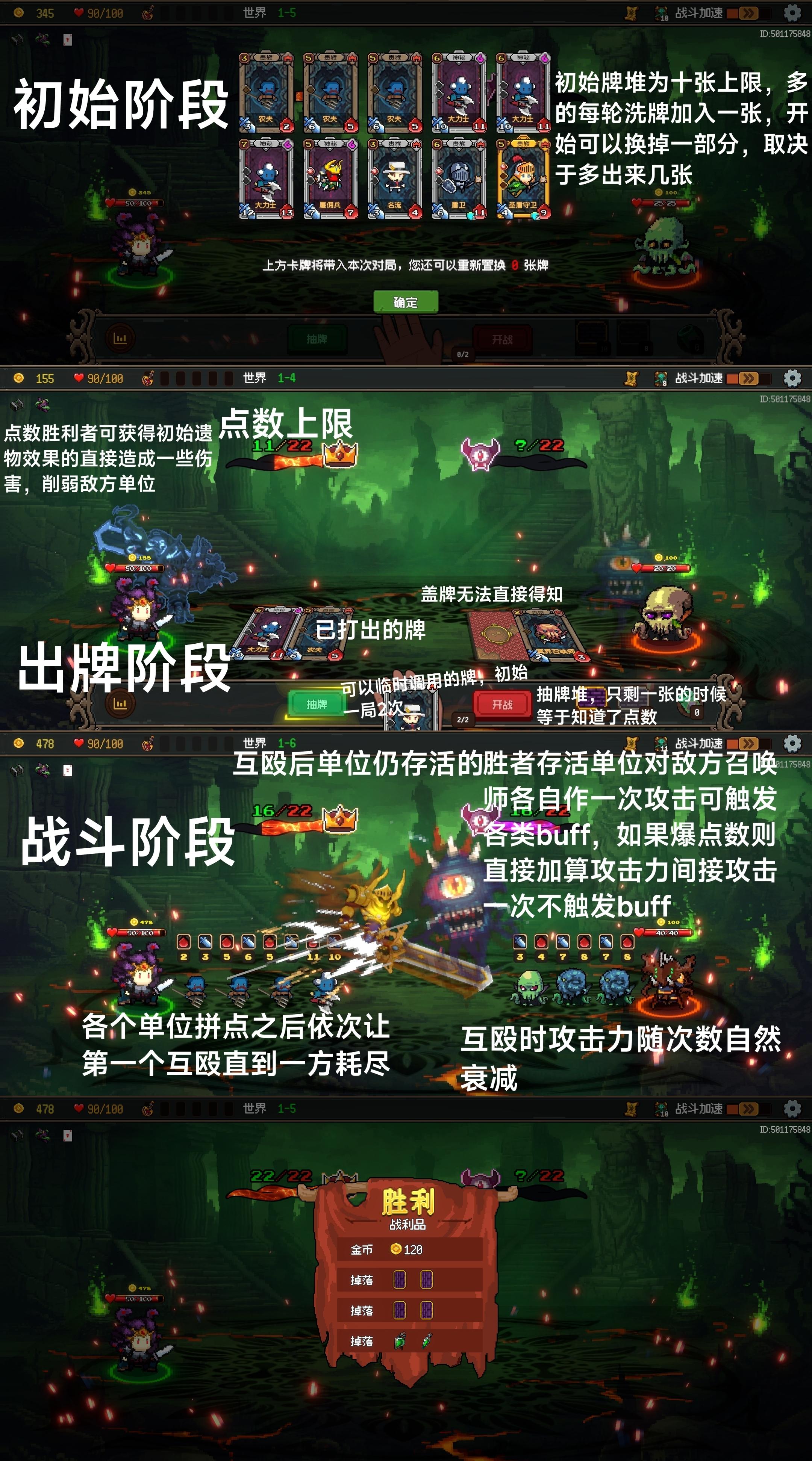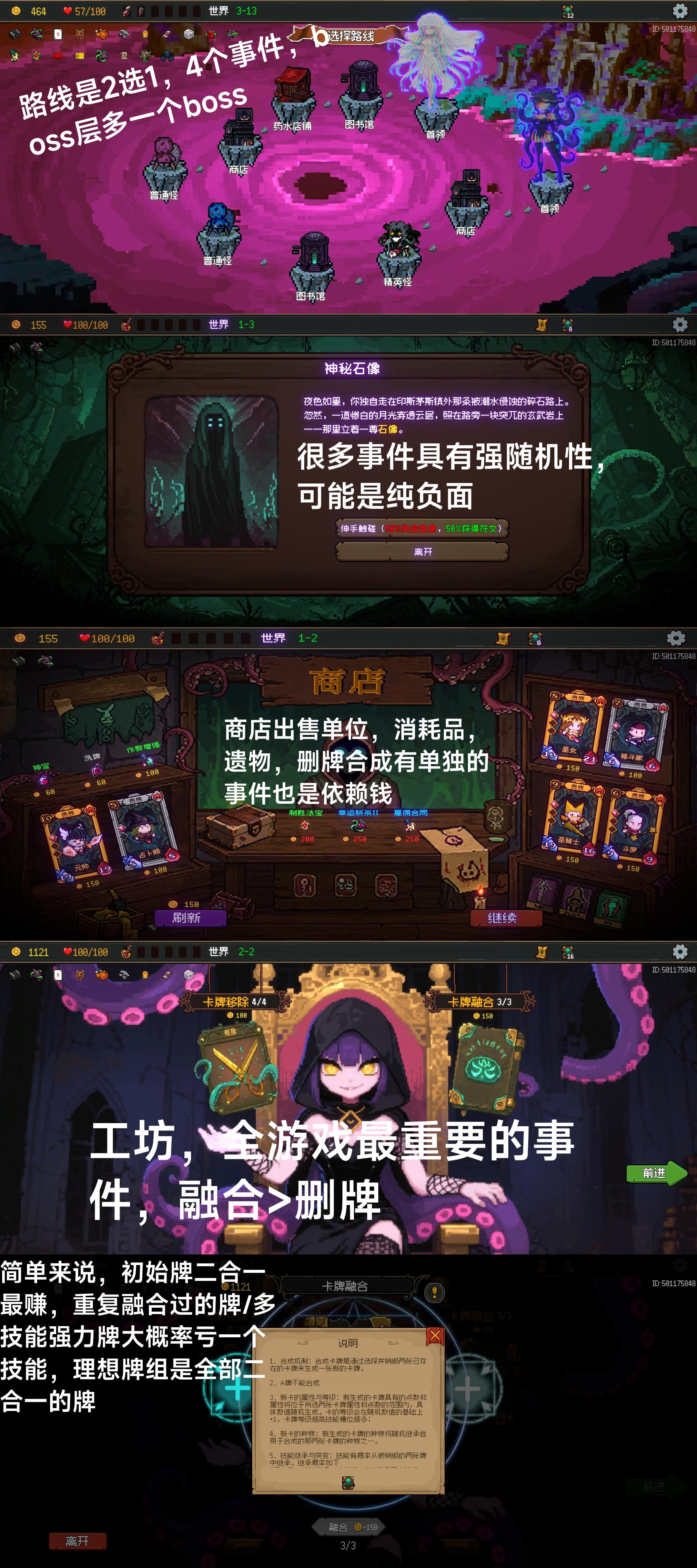 只讨论游戏性整体思路部分 因为非公开测试版大概率会改一些。嫌字多的可以先看图片,有一些专门的文字标注体现我具体想说的部分,介绍了主要玩法本平台的提前测试版只开放了初始角色,但足以看到整个游戏的调性,如果你沉迷此类卡牌构筑类游戏,那也许值得一玩,但是它的局内战斗和构筑流程比较特殊,可能会让人不适应粗略的来讲,这是一个必然有较多随机性的游戏-即使相较于本来就很随机的肉鸽大类来说,传统肉鸽是顺势而为或者roll出流派,神之一手在基础玩法上的凑21点和点数操控更多从底子上就是纯随机了,因为敌人也是这套系统,整个可控的地方就是 整体构筑 和运气(点数,也就是费用)的大体上下限,这导致前期一选卡牌出门奖励特别重要,因为难度曲线比较陡峭,选的不好就是交给运气赌发牌了到了中后期成型之后基本上看一下队伍站位和药水使用时机,不需要太刻意赌牌,除非你全抓6费以上的大牌。因为这游戏构筑的目的是获得不去赌运气也能稳定过的手段,但这也使得早期战斗部分不会太简洁,别的游戏主要的删牌在这里更多体现为卡牌融合,让我想到了怪物火车1代的dlc,你可以通过融合节省牌位,调整费用,初期一定攒下大概1200+左右金币和6张好牌去工坊融合,顺便删初始,后面大概还有2次左右机会,就优先删牌了前期一层一定多抓好牌凑够10-13张 第一轮融合再凑10张以上之后才是挑牌,保证牌组在10-18之间我个人觉得差不多,具体看你是小点数多还是大点数多,推荐6费左右小点数为主防止爆牌,初始的角色出生遗物和卡牌合适的话可以走纯金币流吸死对面,因为金币都是从敌人身上获得,局内没钱了就是扣生命产生钱,也可以走奶妈护盾均卡拼质量,甚至可以靠塞牌流降低对面质量外加给对面爆牌,并且流派可以混搭此外涉及点数加减费用机制的牌必抓:沉默和猎魔人,他们费用较高,找个2 3费融一下就好了,赢一次就一直赢,能滚雪球很厉害,隔层boss掉落有个能将任意卡牌+2点的技能,遇到必选,既可以凑点数,自己满点之后也能给对面做大牌爆牌,因为是局内保留的,其它技能大都是鸡肋强度不高,要么扣自己上限加对面上限,要么需要自己触发爆牌保护,只能用来斩杀或者金币流拿来拖,不泛用整体可玩,就看正式版能做出多少新内容,以及偏随机的强度曲线能否为大众接受,目前一些基础机制是控制随机性的比如藏牌,技能,但是数值都给的比较保守,要打通每一轮那基本上是一个险胜游戏,能打到最终boss就能打过,半路暴毙见不到boss比较多