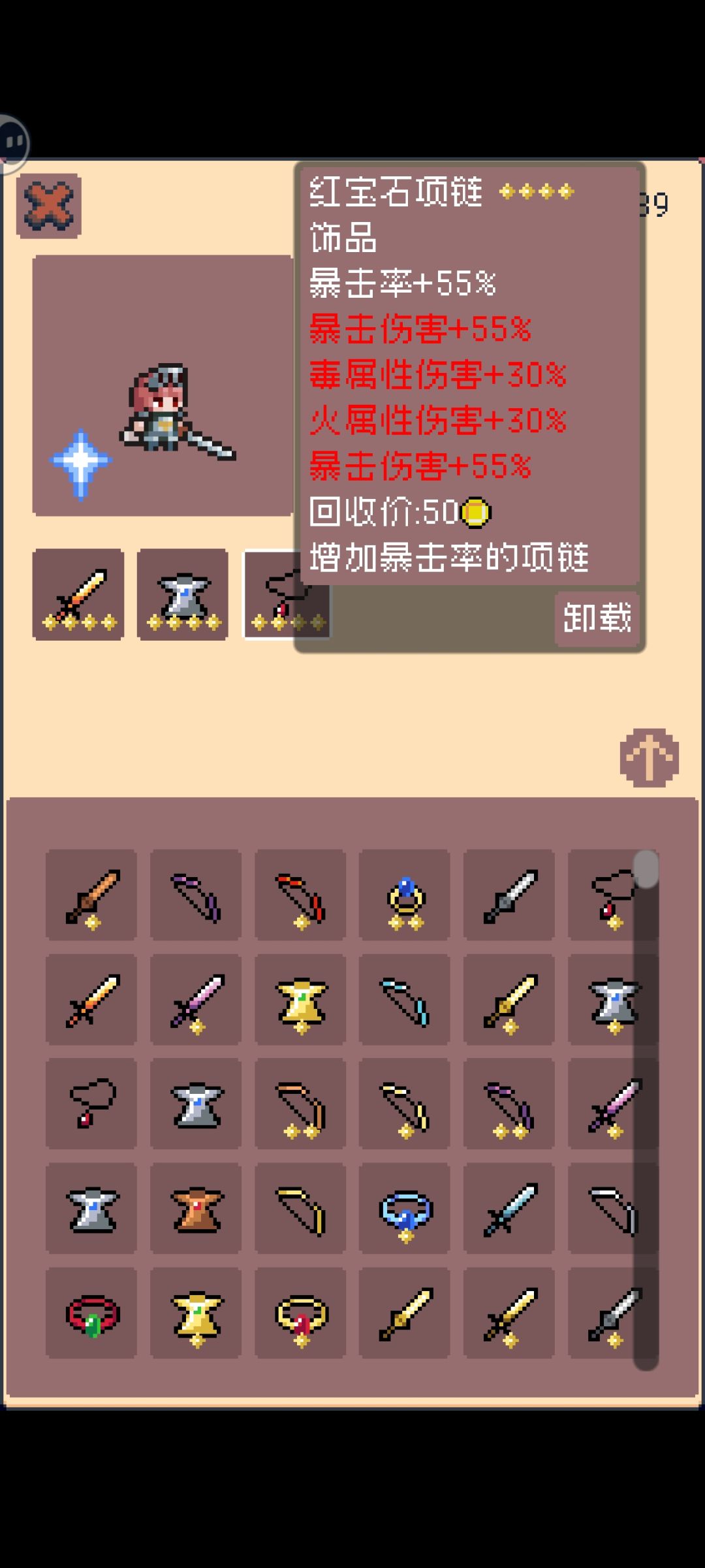 无尽已经30多关了,后面只要怪一下打不死我,加血又加盾,我估计也是点两下就过了,装备四星全红词条,就是玩了个全属性,差点意思,不够专一属性爆发,满暴击很好堆,一个暴击戒指+55,加自选天赋就够了。装备卖不动了,给改良下出个卖装备的吧,合成装备,把需要的词条留着,一星和二星慢慢堆,星差大了容易把四星爆成一星装功亏一篑