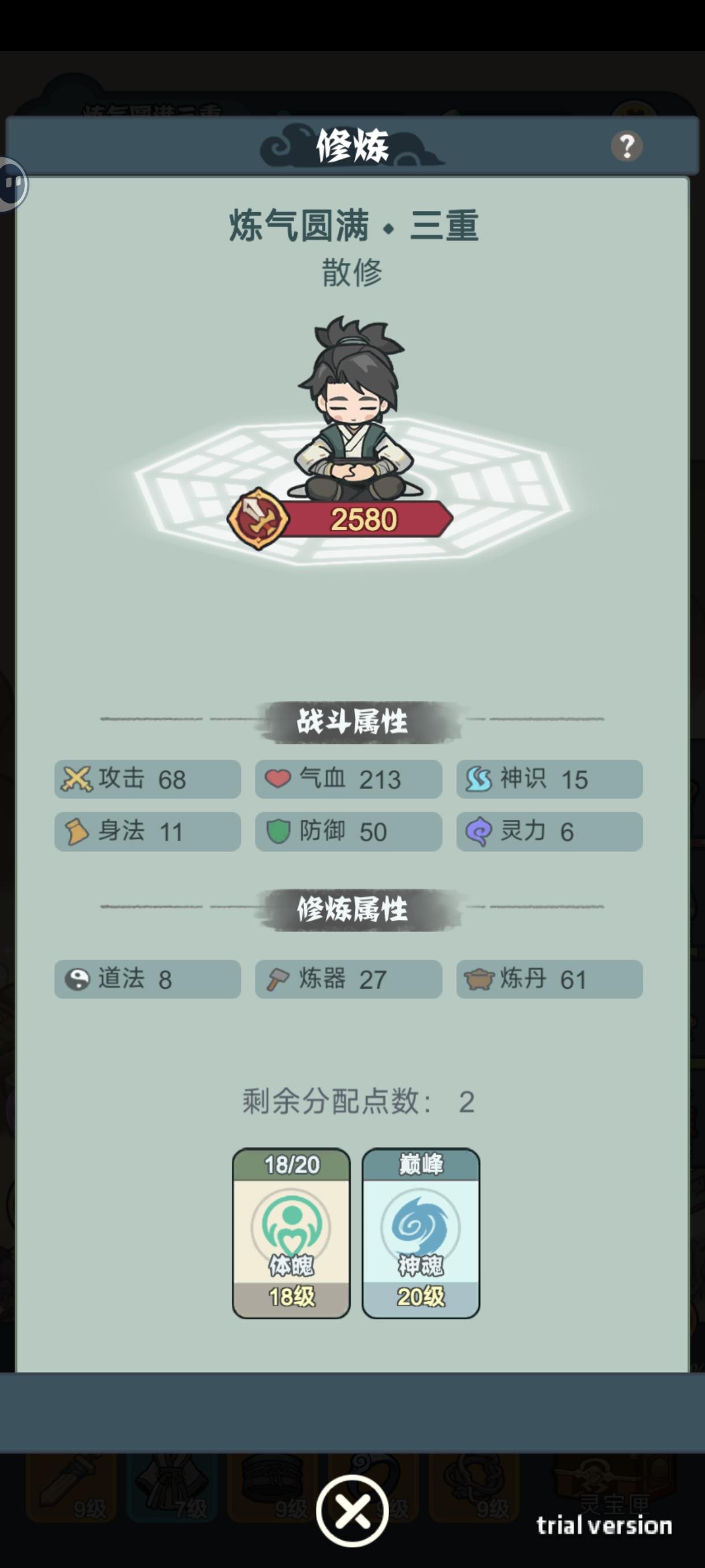 四个地图虽然是逐步解锁,但是可玩性都是一样的,前三个都是到化神满级就完结。第四个地图还没打,现在在考虑做厚积薄发,把天赋全部点满再破境。首先刷地图,最好是只有两个废墟点,因为有两个道法点已经占了两格,这样算下来,还有32个格,八个给熔炉,剩下的全都给丹炉,然后丹炉的升级,一阶都选丹炉,二阶选八个出来点神柱(随机装备品质能提升),因为后期如果全是双丹炉,是没办法获得绿色必要草药的。总结一下,8个熔炉,8个一阶丹炉搭神柱,剩下16个全是双丹炉。如果升级给的选项不合适可以直接关掉重开,纪录不会掉,等级也还在,用丹药升级一下又能重新选。ps:游戏关掉重开,奇遇和突发事件都会刷新,就是说你吃药可能会触发丹毒(又能喜提3个属性丹)剩下的就很简单了,刷到双丹炉,炼丹等级上去了,之后应该能开蓝色必要草药,然后就能刷天赋点了。我还是先建议多玩几把,把主页面的天赋都点一下。我的点数基本上就是300出头寿命,现在还在尝试。终于双巅峰了,最强练气三层😁😁商店直接零元购,买200的炼丹材料拿来炼保底出绿色灵石丹,起码300+灵石。右下角阵法其实有bug,可以制作的时候连续点击,会出很多个灵宝,搞5个铜钱最好,省材料就是最快的累积,寿命50就赶紧做加寿丹,尽可能刷到七八十再搞天赋丹,我这把50熬到20终于刷出来足够的太白锐金兰,一路反超到100多,绿色奇遇不要急着点,有个8000或者至少6000灵石再进去,运气好能买两个寿命,再差也有4k一个命。