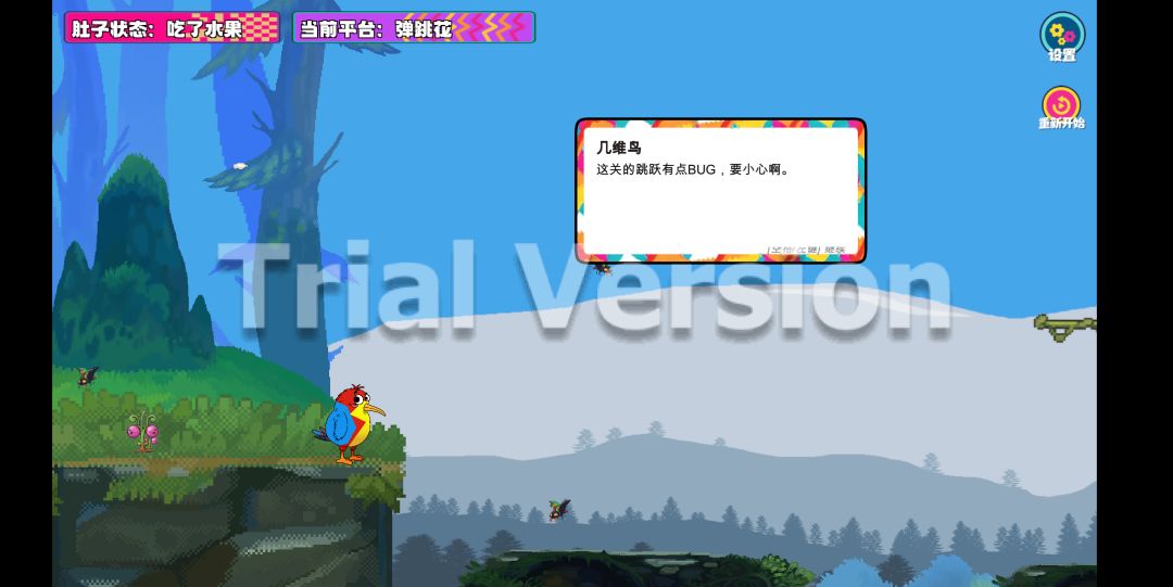 2D像素风,界面结构简单,UI也不多,有少许资源拼凑感。主角是一只鸟,有简单的吃、拉、跳跃等动作,效果很一般。背景是在丛林中,各种障碍很丰富,大部分从外观就能理解规则,意思表达很准确。