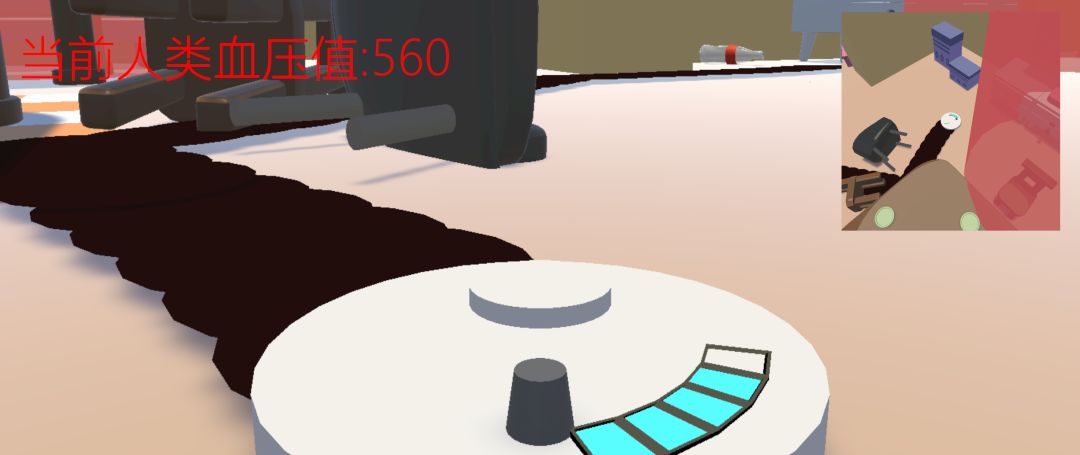 模拟扫地机器人的工作,只不过这里需要把房间搞得一团糟,让血压值越高越好。场上不定期还会出现人类的攻击区域,若处于该区域内,会被发现并直接结束游戏。基础操作没有进行介绍,按照动作类游戏一般设定的WASD来操作,摸索一下上手也不算太难。
