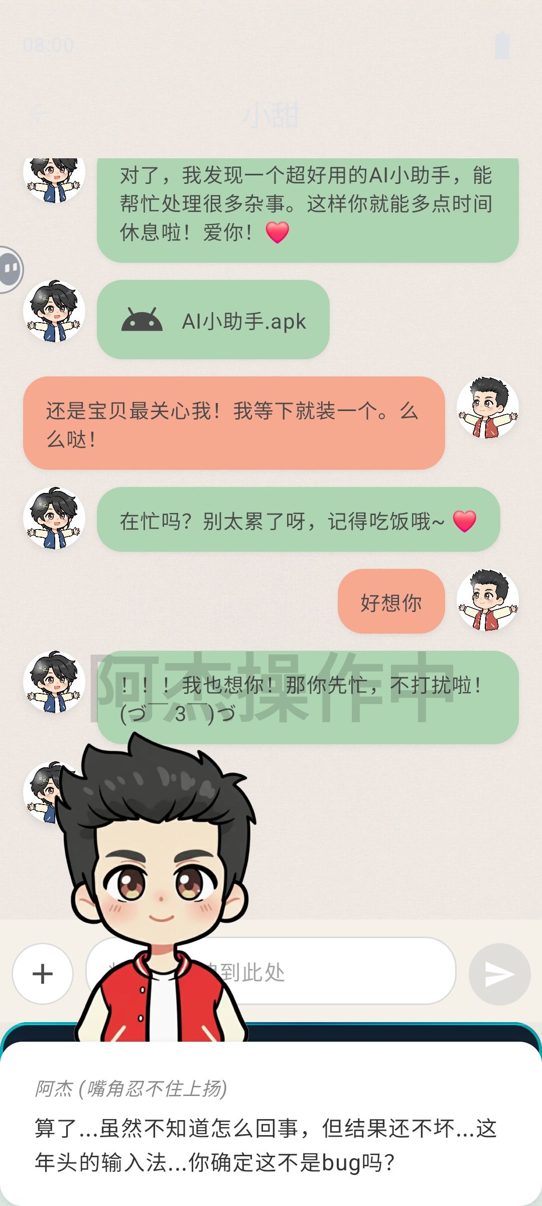文字冒险类游戏,大部分时间是在手机界面操作,AI助手会帮助主角修复与女友的关系,并完成游戏开发比赛,和现实世界情况很接近,有代入感。在主角输入文本后,可以拖拽下方的功能框进行覆盖,可选功能有自动纠错、应用重叠、输入错位等,随着剧情推进会解锁更多。新手引导有简单的操作介绍,大概玩法意思可以明白,但后面功能多了会有点懵。