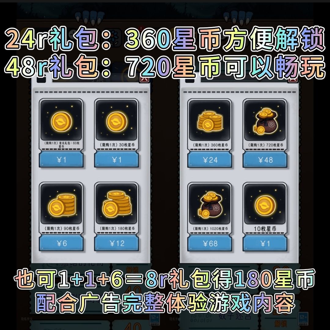 而目前游戏支持的氪金礼包,最高为68r档位(可得1020枚星币),但考虑到全解锁情况也不过是420星币,48r档位720星币已经足够畅玩了;而略微精打细算一点的玩家,也可以选择24r档位360星币,只要不是频繁消耗星币看提示,绝对也是足够用的。