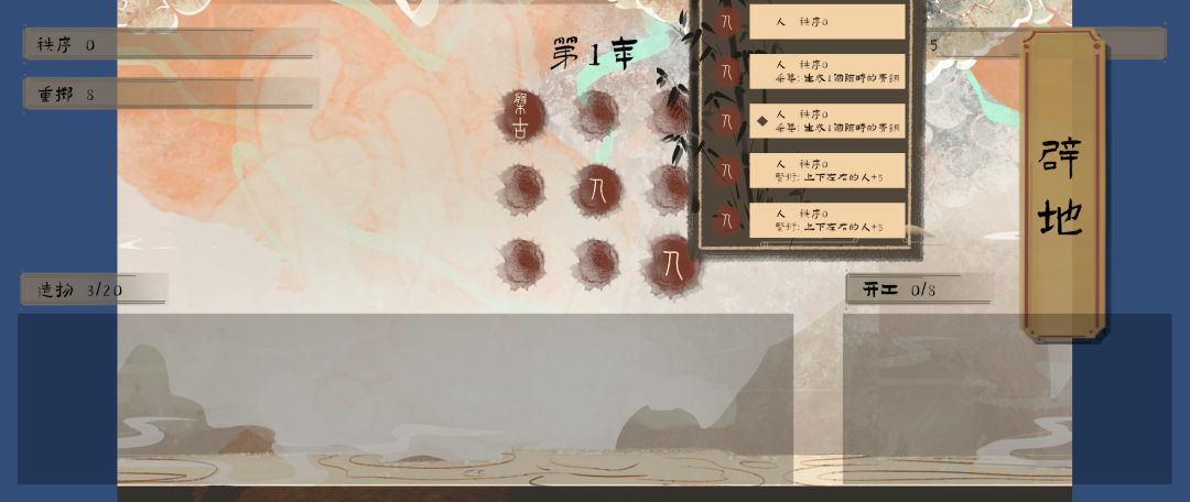 成都场48H作品,模拟盘古开天辟地的过程,有九宫格位置,可以放入下方的造物,每个造物属性很多,与周围格子的造物可以产生相性效果,从而提升秩序值。有肉鸽选项设定,出现的造物种类随机。当关卡核算结束时,秩序值大于混沌值即可通关,反之则会失败结束游戏。没做基础操作介绍,看视频可以有简单了解,更多需要摸索和游戏经验来领悟。