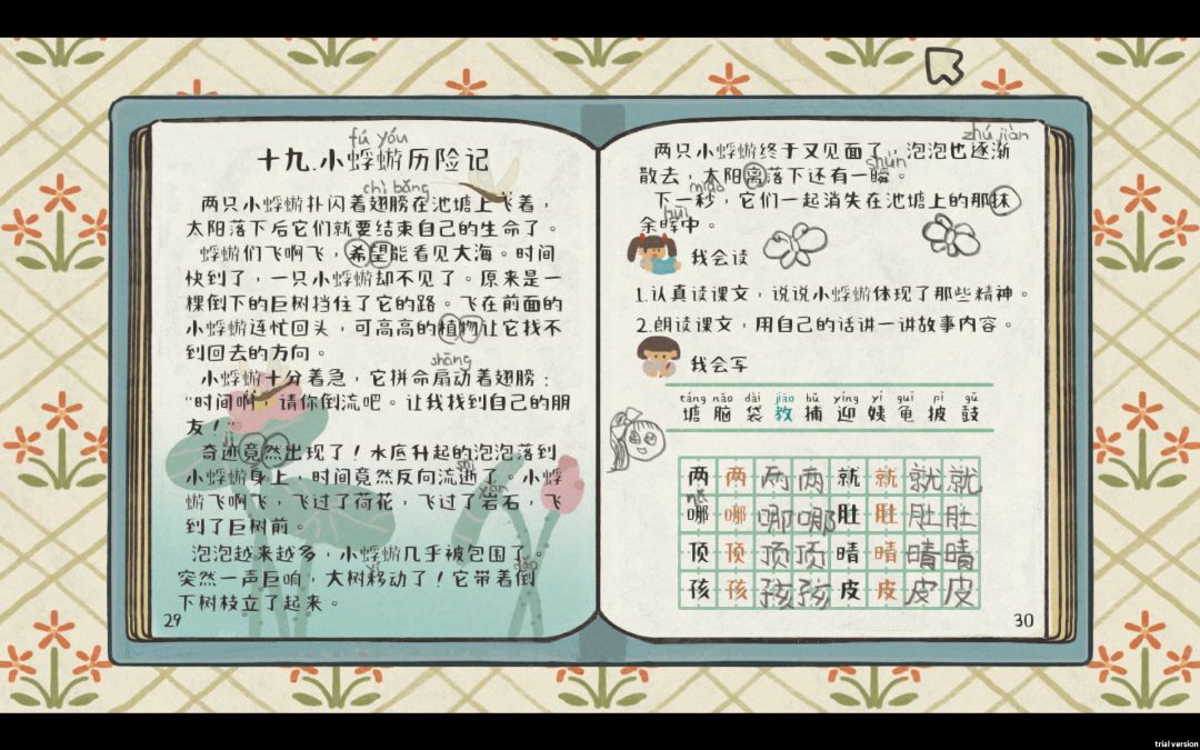 音乐和美术:音乐好听,画风是手绘风格,很清新很喜欢,比如p1手机维修店那条路好有小时候的感觉,又比如p2课文画得真好看,小学生的铅笔字感觉也好像哈哈