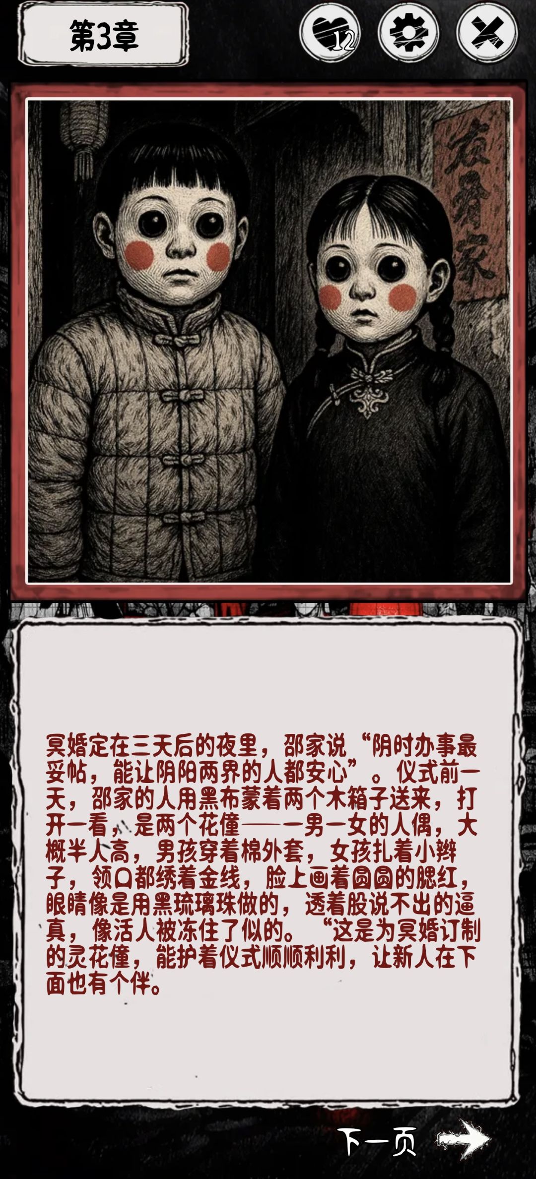 挺吓人滴 这个立绘我觉得非常不错 诡谲又很有代入感 像以前人口稀少的农村 晚上玩后背发凉 整个游戏都是文字加图片 以选择的形式推进关卡 如果你一章内任意一点触发即死 都会回到章节开头 感觉有点浪费时间 希望可以存点