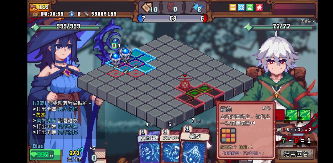 战斗表现很好,敌我双方英雄立绘就站在两侧,像是棋手一样。棋盘格子不是很多,中间区域完全放下,敌我双方阵营格子、特殊区域、手牌效果等,特效意思表达准确,很容易理解。