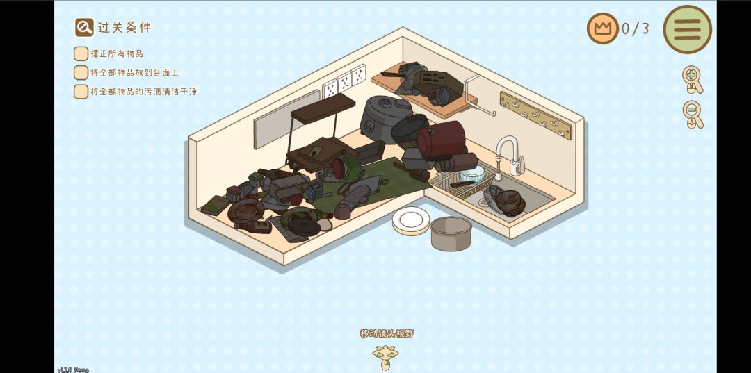 很有意思的休闲整理游戏,由小件物品开始整理,然后扩大到整个区域,还带有故事剧情效果,体验很好。将物品按照现实生活中理解的逻辑位置整理好,满足通关条件即可通关。但并不是所有内容,每一关还有三个隐藏物品,可以探索寻找,这也是关卡评级标准,具有一定挑战意义。新手引导内容不多,点击操作为主,界面上也有交互操作提示,上手很容易。