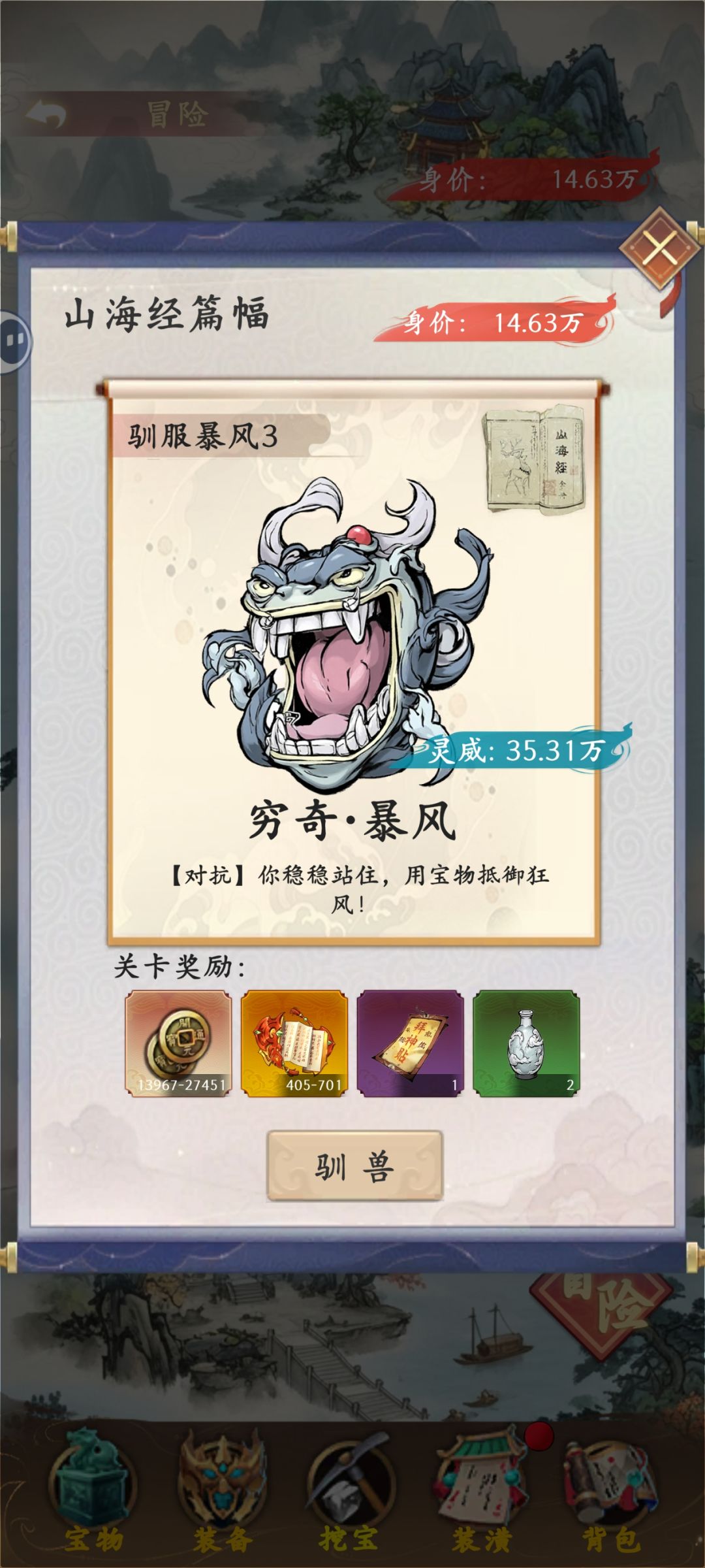 如上图,在更新前我的身价是20多万,更新后我的身价直接掉到8万多。更新前对抗穷奇只需20多万身价,更新后对抗穷奇需要35万多。。身价的获取难度更高了,但是冒险需要的身价更多了。。上文说到一个上品宝物赚金100、升星五星、升级24、品质7的情况下价值是5000多。。现在我能获取的上品宝物只有8个,就算全升到这个程度也只能提供4万身价,我不知道差的二十多万身价该从哪里提升。