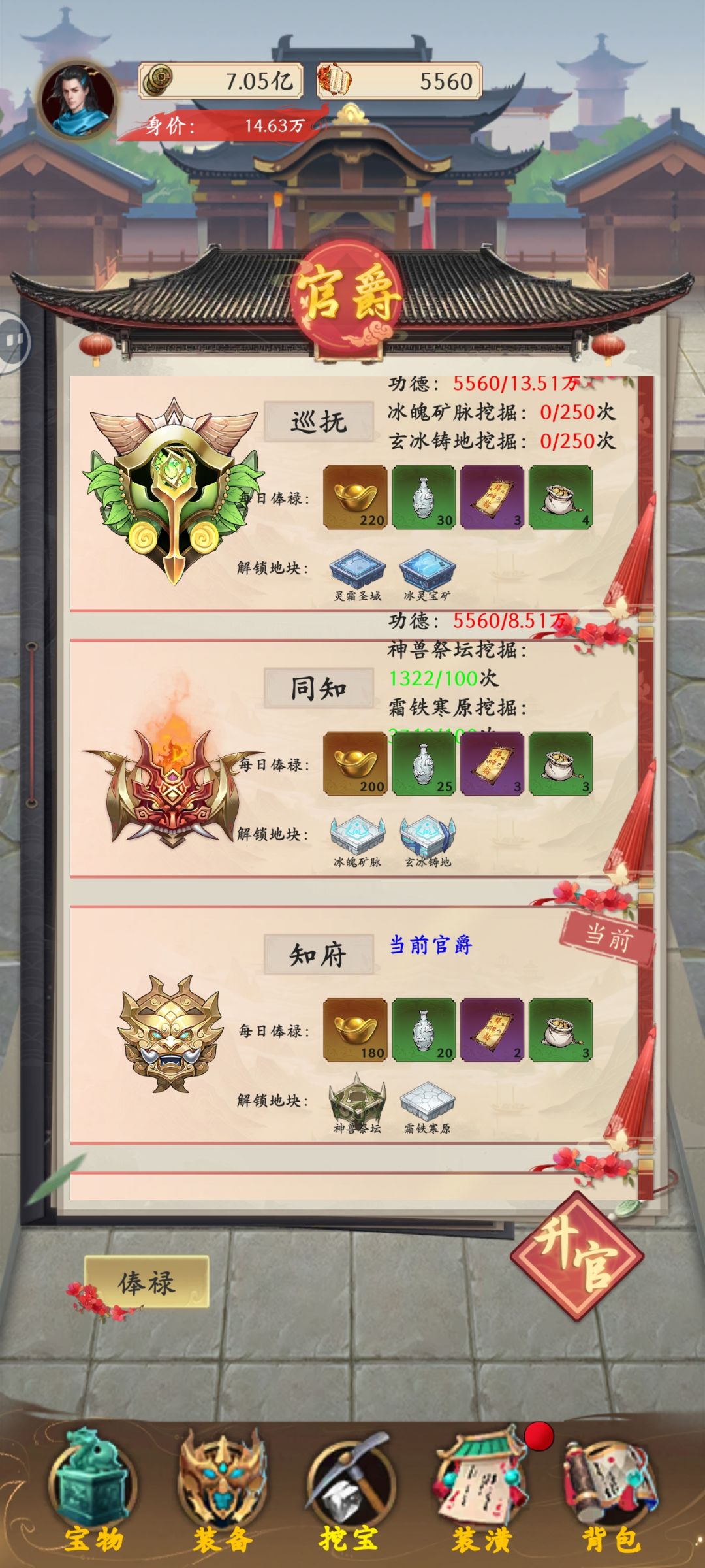 这游戏你能挖的地图决定了你所能获取的宝物,而官爵决定了你能挖的地图,官爵又是靠功德升级的,所以功德决定了你所能获取的宝物。。