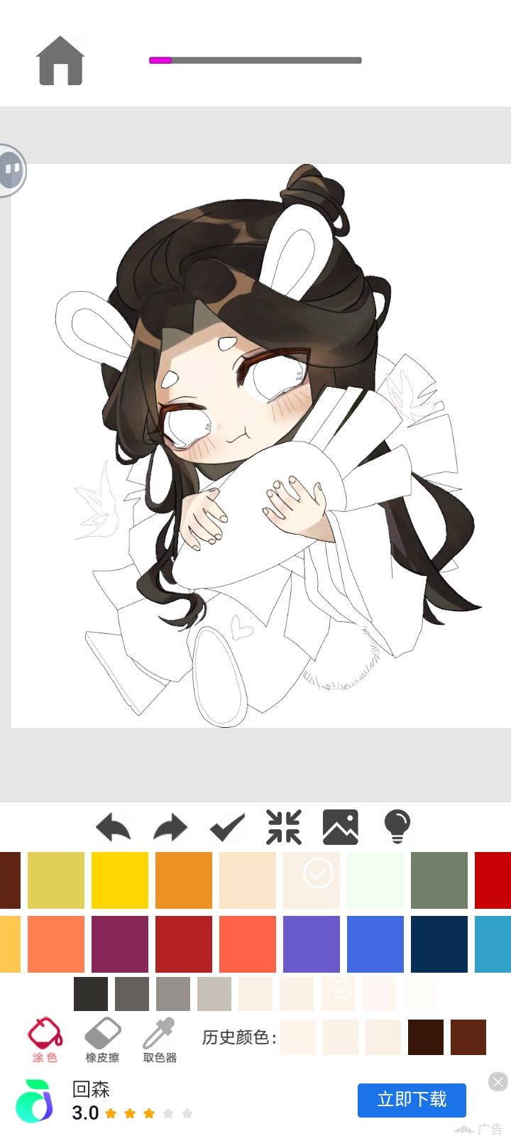 个人觉得还不错,没有想到还带魔道和天官玩(还有挺多的)超多忘羡的图(依旧忘羡99)还有师姐,但是有的图比例大崩特崩,不像人。。但是有广子,不过可以直接关掉,整体体验还是不错的,无聊时玩玩可以打发时间,可以自己调色,也可以用给的颜色,还可以调线稿的透明度,自由度也挺高的,画画一下子就来了灵感,里面还有其他动漫游戏之类的,对新手很友好,易上手
