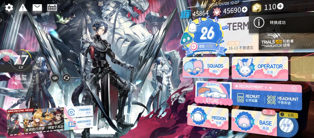 (图片是想给各位准备入坑的看看游戏界面,我这个是三丽鸥联动的主页面,我的退伍配置比较随性,有自己的一套打法,《其实我是轮椅队》,我喜欢谁就谁入队,我也不是强度党,大家不要骂我😥😥😥😥)