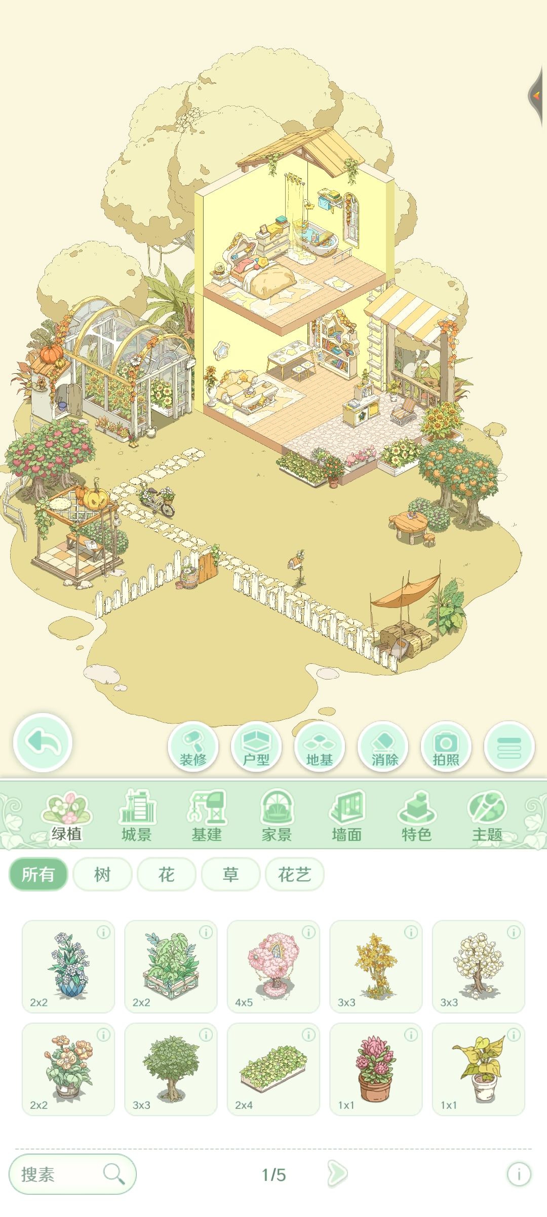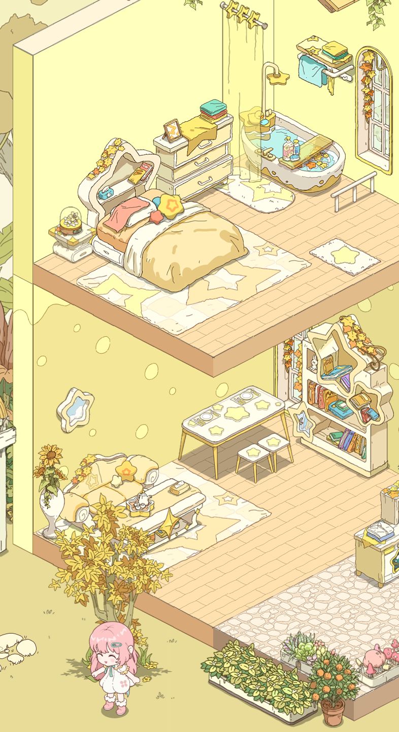 画风比较偏精致和梦幻,然后核心玩法是种植和装修带点经营,装修还是可以的,但是后期就是解锁那个装修用的,一个是货币,另一个则是是颜料,然后那个颜料不是很够用,然后户外装修也是有的,然后家具也不少,可以满足基本的家具要求。