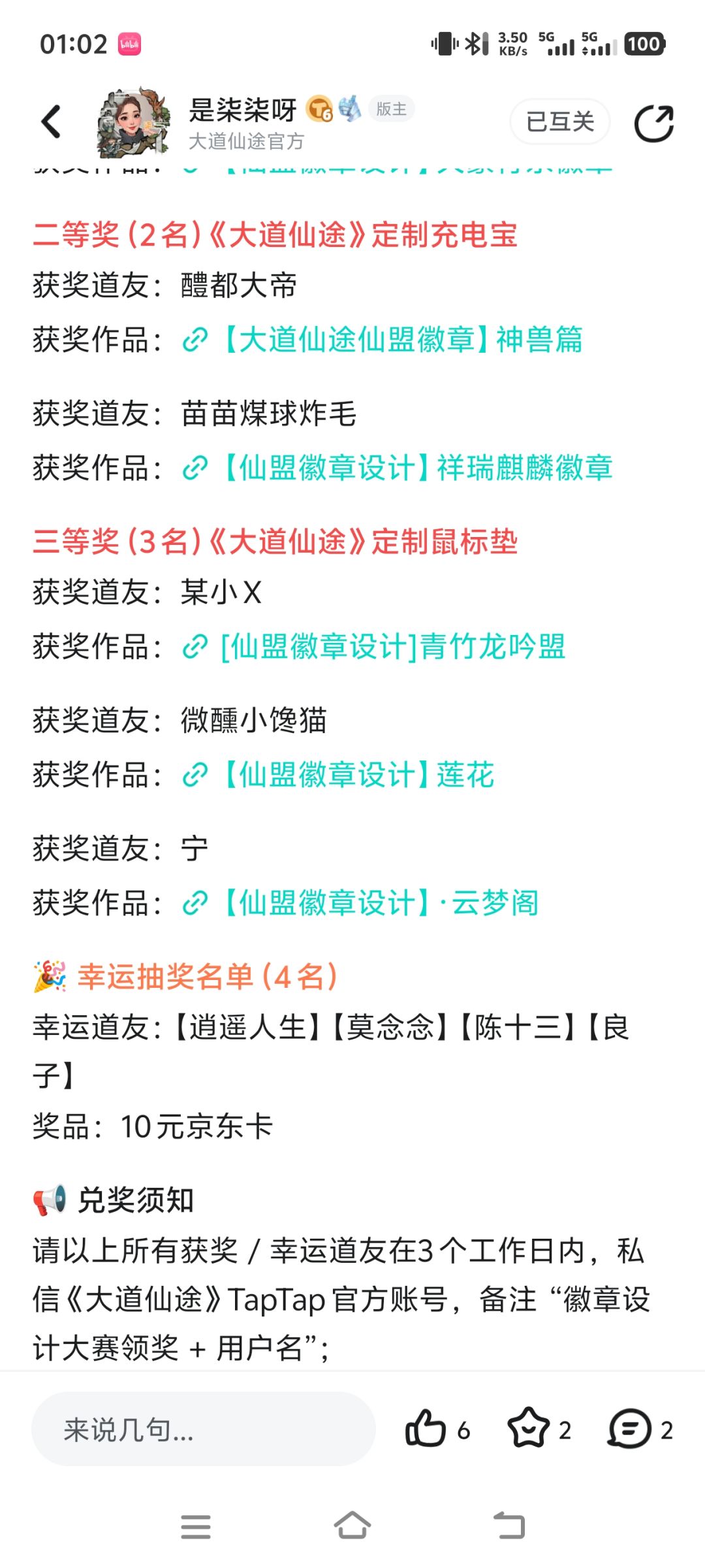 收到柒柒姐送的游戏周边还有特权卡了(≧∇≦),鼠标垫是真的很大,也很好看。祝大道越来越好૮₍˃̶ꇴ˂̶₎ა1月18日追评作为目前参与两次测试的玩家,是能够感受到大道项目组是有想把这类游戏做好的心。反馈问题bug回复都很及时,就是可能因为体量小导致很多游戏里系统优化更新要慢慢来,这在测试群里引起不少玩家的不满。这里我表示理解。希望下次大道测试能做得更好。另外这是我第一次在这种活动中奖,谢谢柒柒😋2月8日追评,这次测试成功在一区符修化神过30关了,第十名,燃尽了