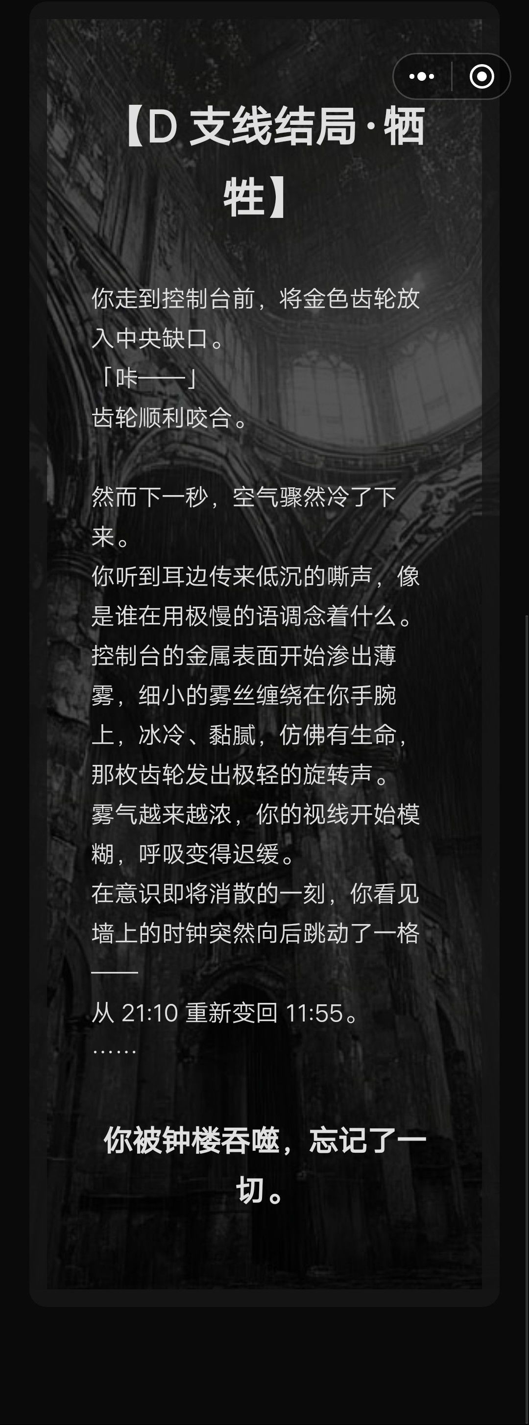 时钟内部注意到第三层文字资料中老钟表匠留下的日记,午夜最长的阴影,选分针(他怎么不提示我这是二选一选错了会死啊……选错结局C),发现D的本本,密码回一楼看没有用上的账簿找到D,编号D-3-055,试出密码3055。