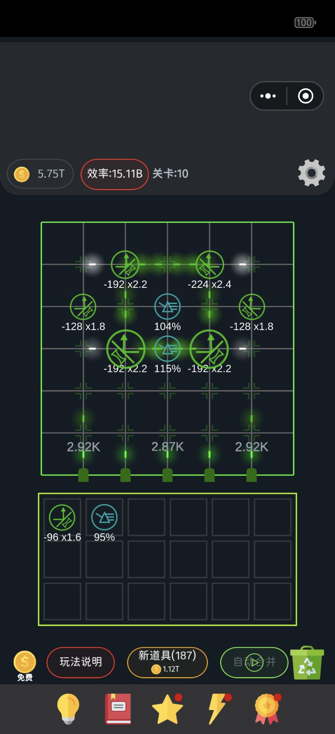 一个有点意思的小品游戏,可以稍微玩一玩,通过研究一个自己的光路来寻找最优解,但是创意不足🕹️耐玩度:不足,游戏看似有十关,实则只有两关,1-2关和3-10关都是用同一个套路解决,没有很好的做出关卡间的差异化。第一关赚启动资金得等很久,广告似乎也看不了,需要等比较长的时间,后面的关卡就可以通过领取前一关的任务来赚启动资金。保存功能也有问题,退出重进你不知道它会存到什么时间,同时离线收益和运营收获不关联附一个我玩的时候用的光路,感谢论坛大佬的攻略1-2关(图一) 3-10关(图二)