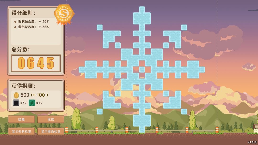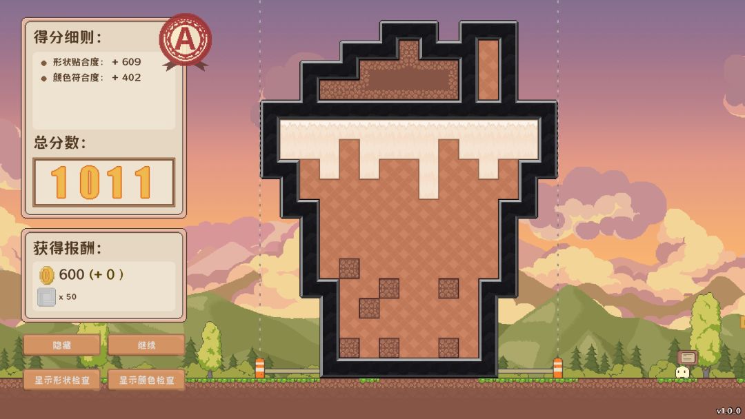 两种主要工具,可以直接用键盘C键切换,不小心盖错位置或者盖错种类的话用钻头拆除,被拆掉的正常用各种建筑材料的话可以打开背包界面再进行拖拽。一般的订单会明确列出来每种需要的建筑块的数量,不过建议还是多备一些,因为有几次我感觉明明达到要求了,但图纸实际施工起来,会遇到某种颜色缺几块的情况。而且因为我们只是颗蒜头,跳跃能力有限,超过两层块的地方就跳不上去,需要用到一定的建筑技巧,太高的地方或者忘记填充的区域可以用竹蜻蜓飞到指定地方,记住这个飞翔的时间很短,一定要。不过这游戏对于建筑要求其实并不严格,可以虚空放置,蒜什么的可建造范围也很大,所以不用担心频繁地使用竹蜻蜓的问题,实际上我一般都会设计一条合理的通道方便自己撤离,当然实在不行,直接砸穿一条线也可以撤离。交付订单后会显示我们在颜色和形状上不合要求的地方,也算是有个不错的交代,让我们下次做的时候更细心一些。