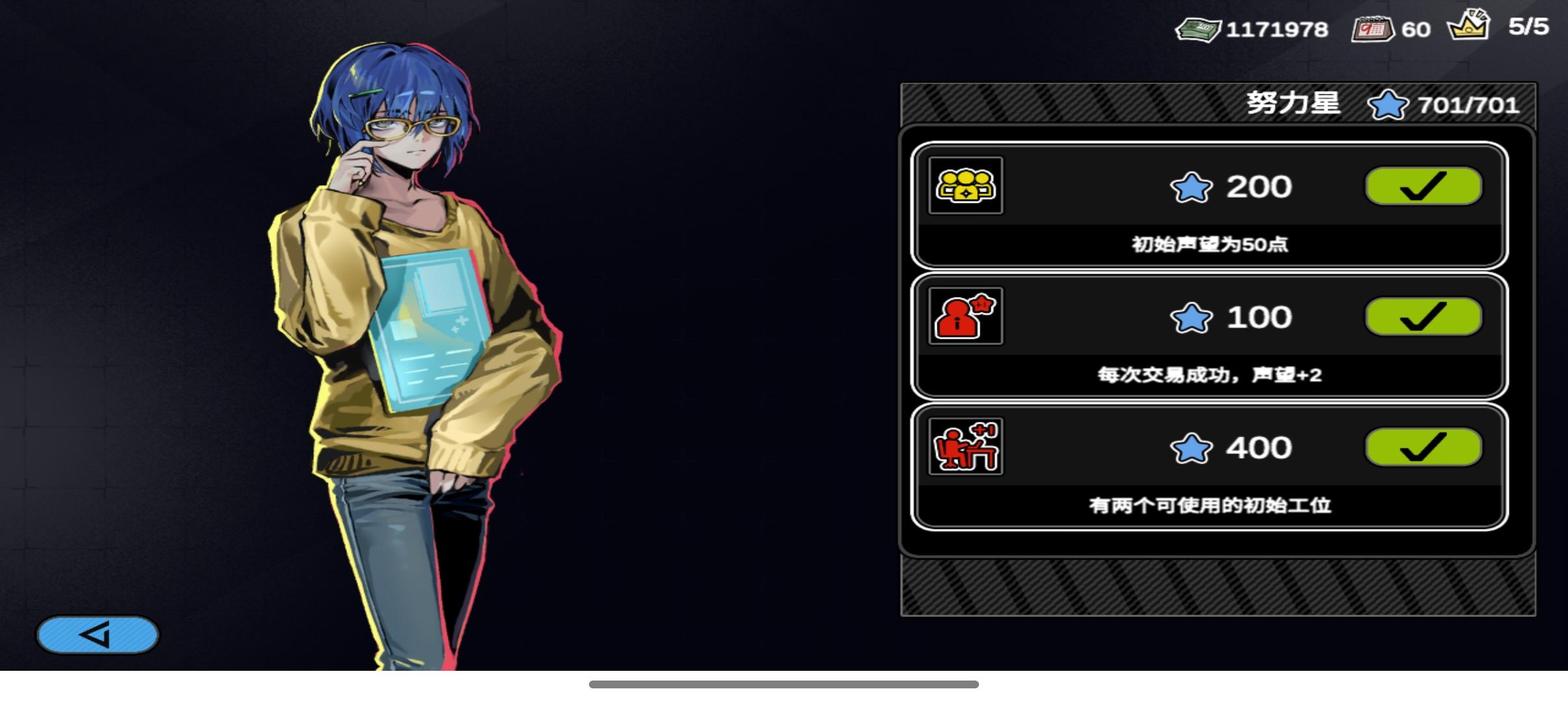 不知道因为什么原因点的预约,但既然是新游戏高低来体验两把,就测试版体验来看游戏还不是很完善,虽然立绘挺好看的但各种界面以及转场都很生硬,虽然不影响体验就是了。简单来说这就是一款开档铺的游戏,至于赛博题材以及其相关剧情就相对很流水账了,仅有的一些变卖物基本上还原不出太多世界观,剧情的话就是父债子偿的开局并没有什么亮点,所以直接快进到玩点叭。省流:纯单机休闲来的一款模拟经营,你要做的就是培养员工然后每天坚持开店做生意和客人打口水战低买高卖如果可能再顺带做几个定制委托,内容就是这些,一口气就讲完了。四星原因:新游戏,同类游戏少,做的不能说好但至少看得出来有用心。1月11补评↓(剧透警告)回来一看已经不能玩了,就去浏览器上面下了一个想试试打到结局,然后我就在三周目办到了(附图),已经没有任务了,再往后面打应该就是无尽模式了。完整的体验了之后才发现这游戏也就开头有点味道,会让你感受到一些紧迫以及对自己策略正确的满足,中后期就纯重复操作了,把有负面词条的变卖物洗干净拿出去照三倍价格卖,把词条等级低的变卖物重刷下词条拿出去照十倍价格卖,如果变卖物本身词条就多或者你自己又给它贴了些词条的话卖出二三十倍的价钱也是有可能的,玩成这个样子这个游戏的寿命其实也就到头了,因此评价我得扣掉一颗星。然后就是这游戏里面为数不多的剧情了,两条支线一条主线,虽然没有刺可挑,但水也是真的水,支线一就是帮助一名机械师少女买走她的货为其提供资金支持实现它的传奇梦,支线二就是帮助一名资深游戏玩家买走他的货为其提供资金支持帮他做出自己的游戏,主线的话就是挣钱还债然后在结局的时候找回自己丢失的记忆,依旧各一句话概括完()建议↓虽然bug不多,但该修还是得修。稍微做一些转场,只是一些不会动的图片的话玩法再好看着也很劣质。最好多添加一些强劲的随机事件并增加这些随机事件的出现概率,对于游戏的前后期来说都算是增添趣味性。希望打到结局的时候可以自行选择结束游戏进行结算,不能手动结算的话大后期的档挺难玩崩的说,存的一堆钱都转不成局外货币了说。感觉可以在剧情上面多花点心思,想不出什么好剧情的话多玩玩梗或者说整点文青病也行,就测试版的三条剧情来看平铺直叙的级别已经赶上我的小学作文了()约两分钟后补评:通关的存档是可以正常结算的,刚看了其他人的评论才知道,60天后再打两天就行了(附图)