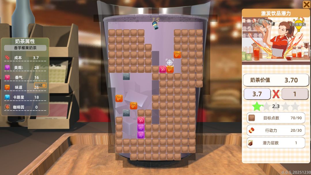 自定义饮品的内容前面也讲过了,总之就是各个部分逐渐的叠加。但是在调配完成后,我们需要进行一个小游戏来决定新饮品各方面的评分,这些方面包括:美观、香气、味道等评价。小游戏的玩法也不难,就是通过点关卡里的一些带颜色的小方块获得对应品质方面的提升,而且最后的星级是可以超过十分的。