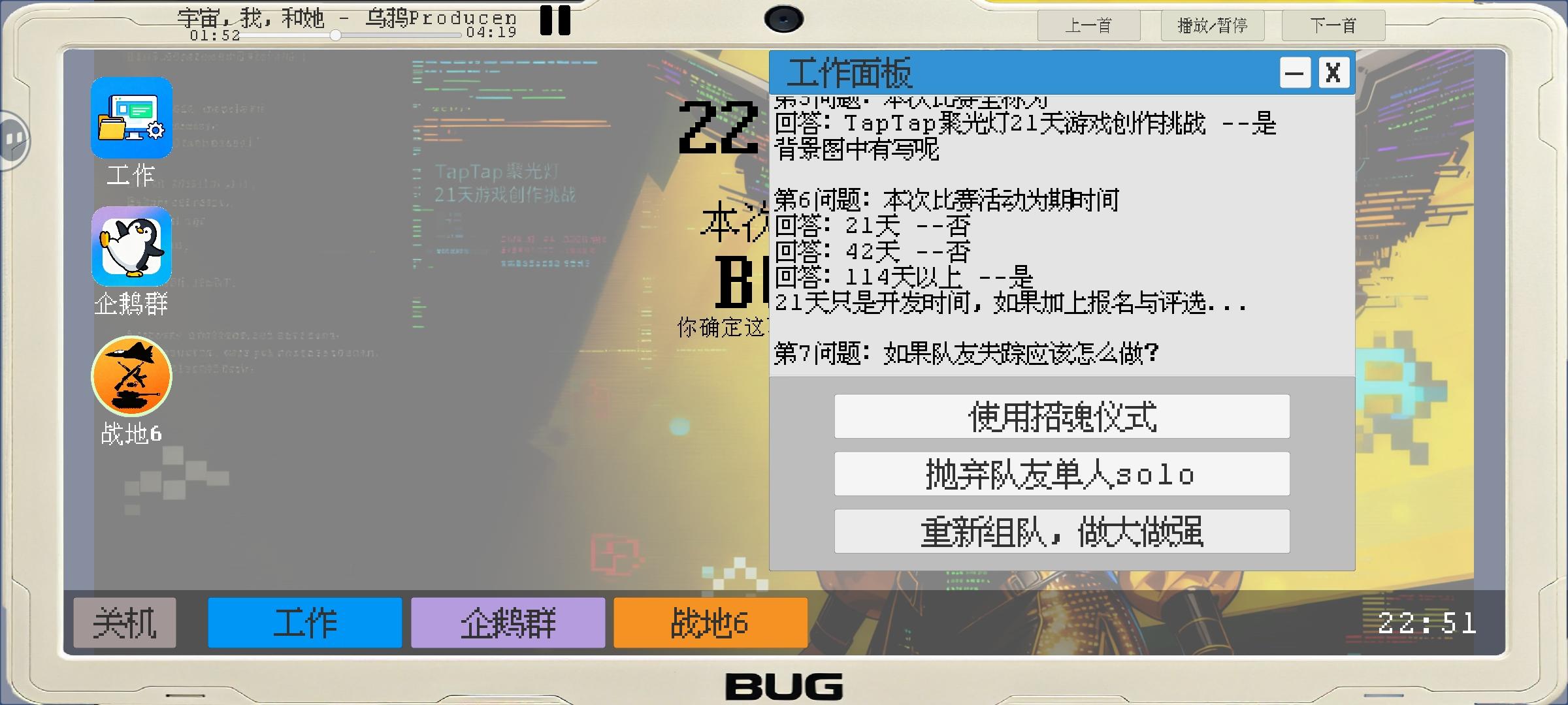 🎮可玩性:以目前内容来看算是个轻度休闲游戏,利用今年的聚光灯主题,做了一个开发者生活的小片段,其中包含了工作、企鹅群聊天,还有作者喜欢玩的战地6,内容不是很多,功能也很简单。工作内容很简单,点击选项即可,直到选对为止。引导内容比较特别,以群规指南的方式来进行,多翻几页还能看到真正注意事项。题材设定与聚光灯bug主题关联性并不强,但世界观层面事件本身就是比赛内容,从开发者角度可以形成很好的代入感。很多设定带有搞笑元素,比如群指南、战地6打开后的小视频等,能看出作者是个很会搞怪的人。🕹️耐玩度整体流程并不长,模拟了一天的工作,聊会儿群,工作一会儿,打打战地6,一天就过去了,然后关机睡觉,大概20分钟就结束。🌃画面音乐:纯2D界面,只有这一屏,所有界面都在一屏内展开,功能逻辑很清晰,UI有些像旧版Windows效果。有二次元美少女立绘,作为背景没有任何动态效果,看上去有明显的AI绘图痕迹。打开战地6可以播放小视频,也是网络中梗很足的视频。✍🏻建议:1-题材上其实有点偏,不过作为单机独游还是可以的。其实可以把实际开发中的趣事整合到游戏中去,就像群聊和工作那样,趣味性还是有的。