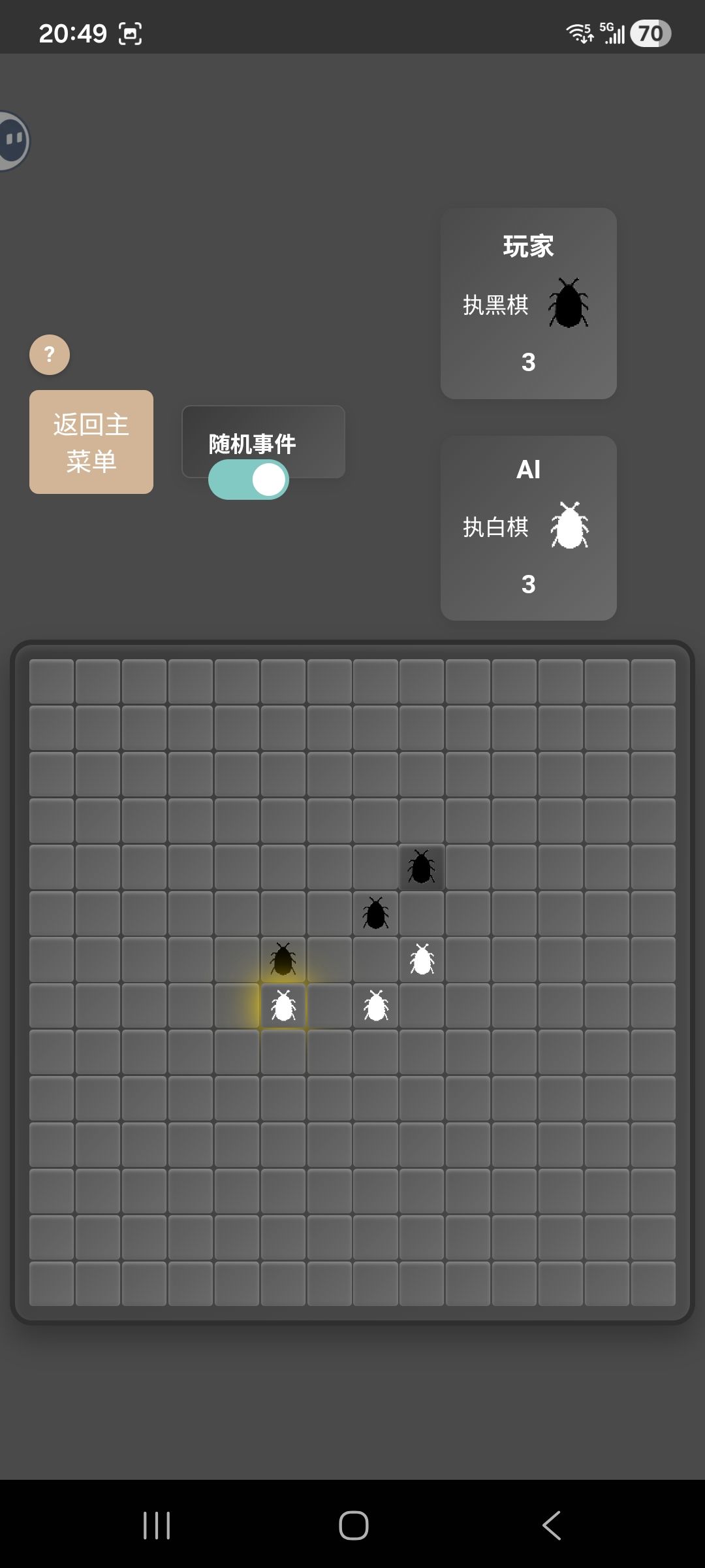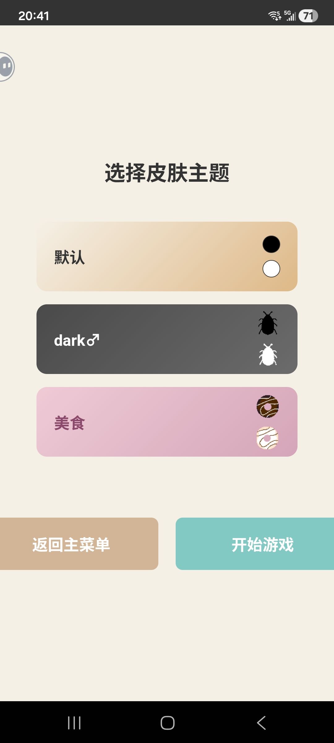 很像五子棋的棋牌类游戏,规则设定在五子棋的基础上有微创新,每隔几个回合之后会进行黑白子转换,还是五个连成一线胜利,难度上感觉不是很高。除了常规互换的设定,还可以开启随机事件,似乎是已经落下的某一个棋子随机移动,随机性效果很好,有时候能起到意想不到的效果。单独界面有文本内容介绍规则,比较好理解。