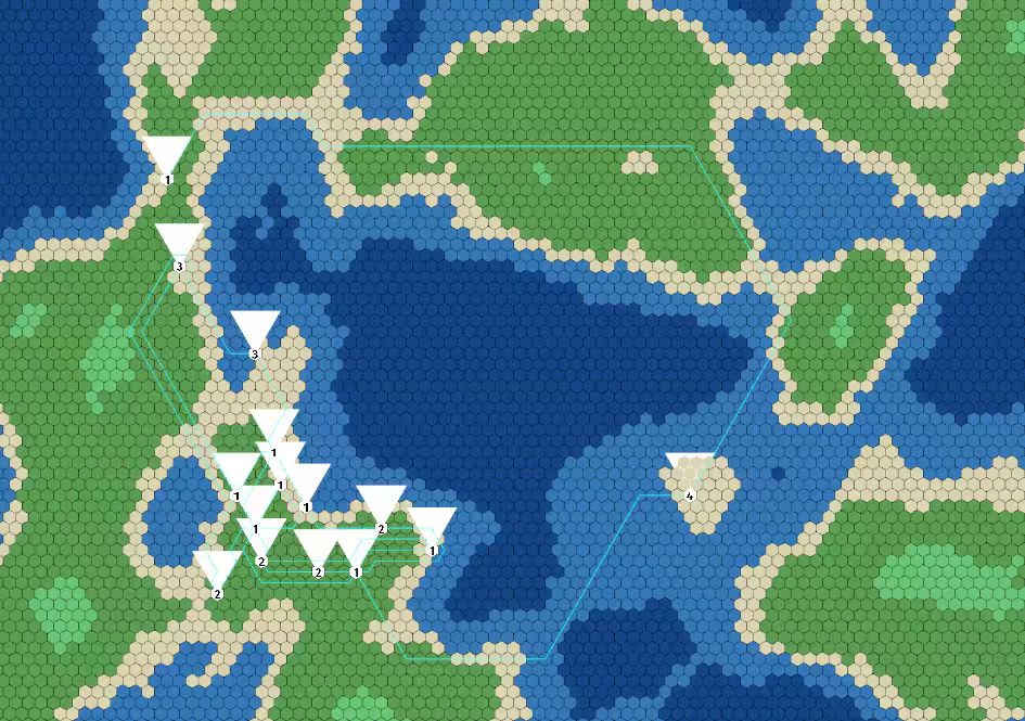 宣传图挺完整的,而且色调鲜明,包括一些比较有代表性的突出,他这个游戏的元素,比如说航线啊,比如说飞机啊,都有描述。然后游戏内就非常的简洁了。主要是有一张六边形巨大的地图,然后模拟了一块陆地,用蜂窝的方式去表达坐标或者说位置,深蓝,色代表是深海区区千深蓝色代表是深海区浅蓝色代表的,是浅海或者是湖泊,然后白色应该是低洼平原,绿色应该是高山最浅绿色的,应该就是高原吧。有点类似于小的时候学的那种,等高线平面地图。 美术没有什么能讲的地方。