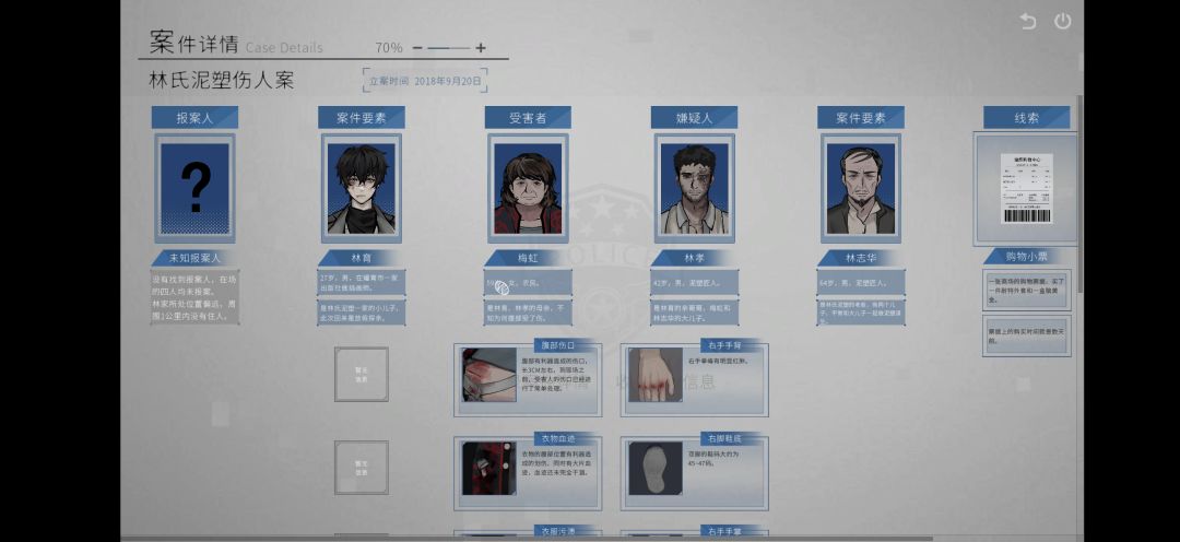 2D卡通画风,界面结构简单,功能逻辑清晰,有很好的案卷展开动态效果,富有科技感。主角为女性,造型设计比较中性化,看起来挺干练。部分角色带有脸谱化设计特点,一看就不像是好人。场景和线索的地图逻辑很清晰,也符合一般世界观认知,盲猜都能知道哪里是线索。