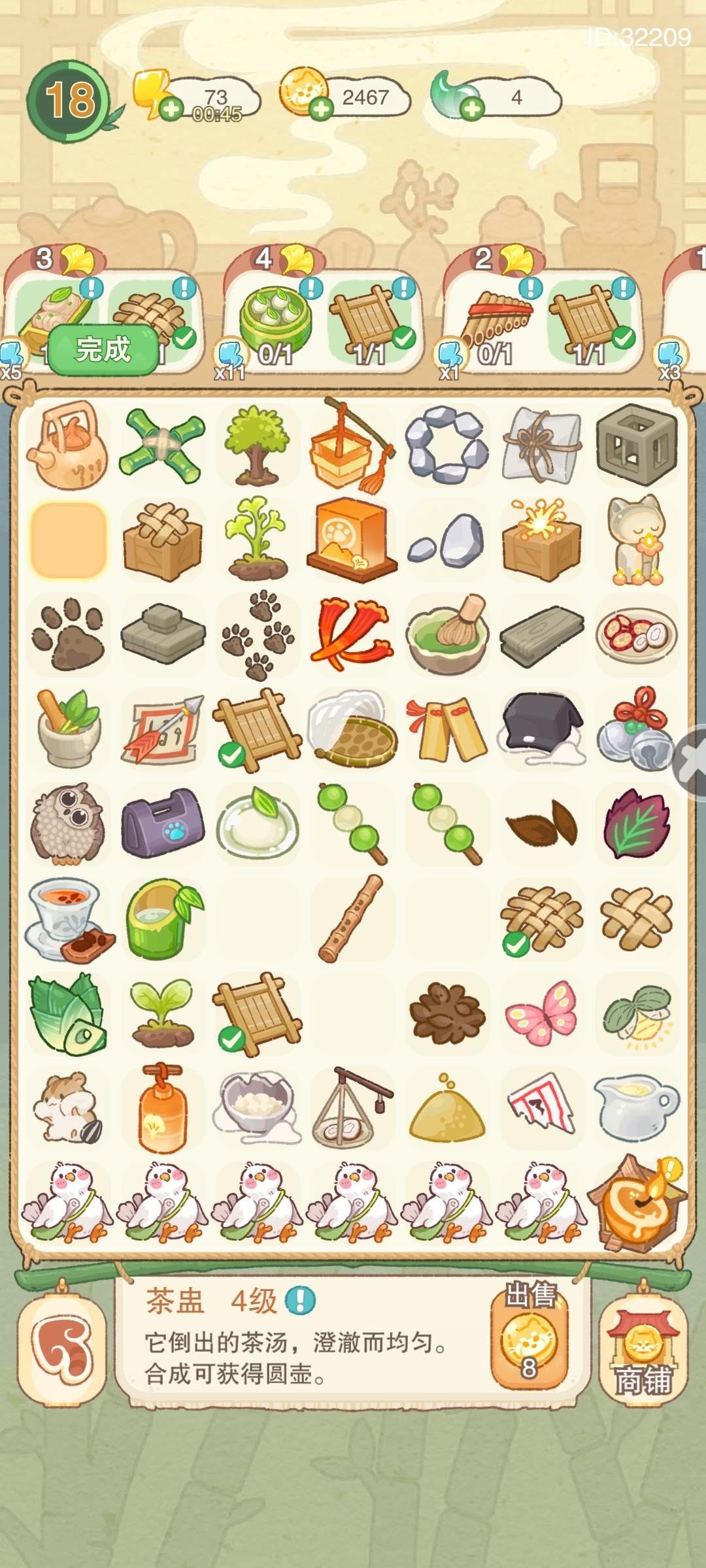感觉测试结束的好突然啊,可能是我没看公告什么的原因吧,9点多还在玩,10点多一上线却发现结束了。总体来说还是很不错的,可能是我玩的进度有点慢,这个鸽子及其产出来的东西没用过,一直堆在棋盘里。体力是首次10尾玉100个,每买一次价格×2(我只买过10个20没买过,是猜的)我玩的其他合成游戏事首次5个,相比之下更贵。建筑什么的我只解锁了前两个区域,第三个区域还没来得及解锁,不过画风什么的也是很可爱😋这个提灯貂也是😋然后是应该是10级还是多少解锁的农场(是叫这个吧好像)他里面是独立的体力,上限65,用尾玉买的话还是挺贵的,好像是25尾玉100体力,我没买过,应该也是每买一次所需尾玉×2。最后是一个自己装扮房间(叫啥)总共三个,除了第一个免费送,其他两个都要解锁对应的小熊猫后才开放,其中一个叫夫子熊,另一个不记得了。家具什么的是通过抽奖获取的,抽奖卷在一些活动里获取。bag也是有的,比如茶蛊消失术和缩小术(P2、3),右下角还有两个物品重叠在一起(P2),缩小为移动消失的物品后造成的,但解决也很简单排,左下角返回箭头重进就行。除此之外还有前几天玩着玩着突然发现我的尾玉清零了;物品放仓库太快导致直接卡没了。应该没啥要说的了。