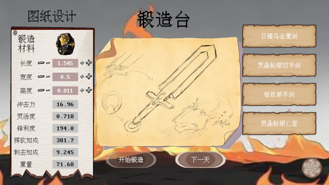 游戏开始时玩家在前台招待客户,客户有的来做武器,有的是来售卖材料的,游戏经营一段时间后玩家转到工坊界面里制作先前接到的客户项目,材料有三个属性,分别是高,宽,长。武器分为6个属性,分别是冲击力,灵活度,锋利度,挥砍加成,刺击加成以及重量,其中武器的绝大多数属性和材料的三个属性有很大的关系,材料的各个数值也是有阈值,由于游戏内没有引导内容,很多内容没搞明白,比如开始锻造的前提,灵活度如何快速提高。游戏的图纸显示做的很好,非常直观。游戏右下角的圆形按钮不要点,点了后会弹出退出菜单,菜单里没有返回选项,按了esc也无用。