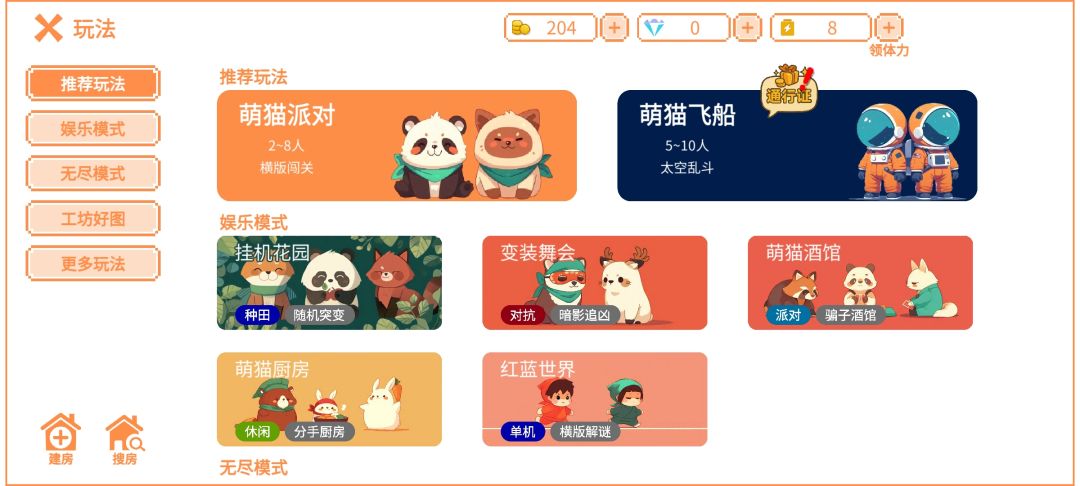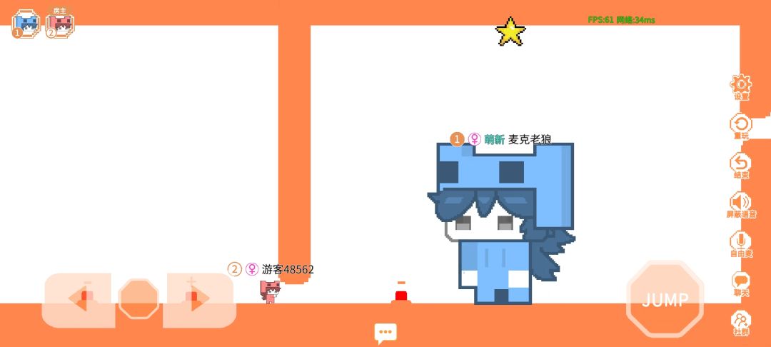 2D平面派对类游戏,房间支持2-10人同时游戏,玩法内容十分丰富。新手关卡分三个难度,还可以玩玩家自创的关卡。游玩需要和别人组队,最少两人,类似双人同行的方式,关卡需要相互配合才能完成,支持语音沟通。游戏过程中若有任意一人挂机,就很难进行下去,是个需要高DAU的游戏。