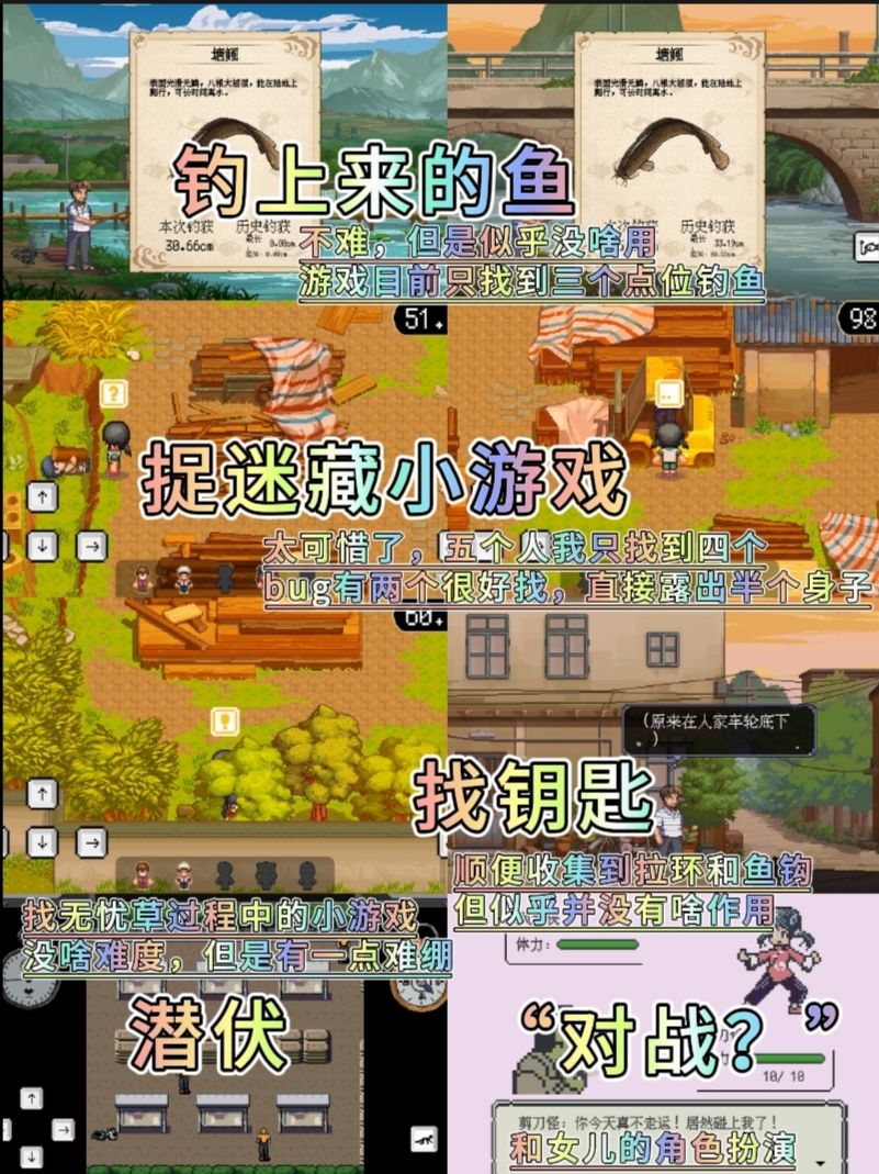 钓鱼,其实就是纯钓鱼,一般第三次沉杆就能拉钩,然后反复点击即可成功钓鱼,目前只找到三个垂钓点位,可以钓到三种不同的鱼,但是...没啥难度,而且也没什么特殊奖励(可能有成就?)