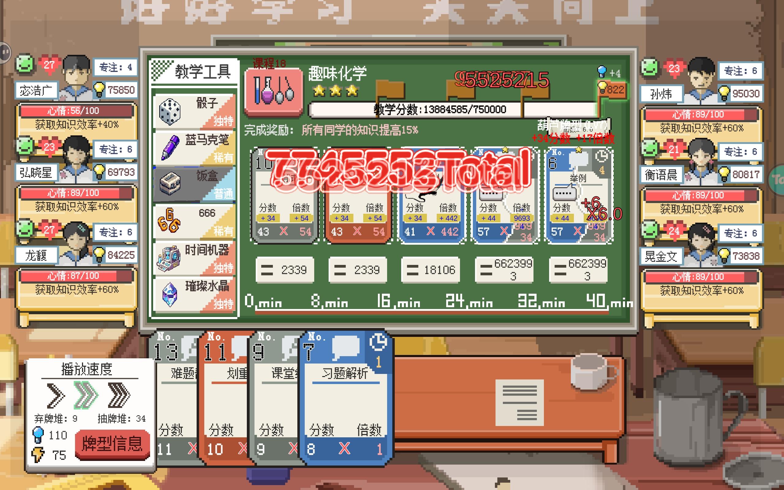 毕业套装,没有的教学工具,去工厂的老头那里买,将心情维持在高点,可以提高专注,将教学楼升级也可以提高专注,专注可以提高获取的分数,另外,可以通过食谱做的食物提高专注。选择666教学工具,葫芦形牌,骰子教学工具,增加牌(增加卡牌6,复制卡牌6),轻松上千万。-----(另外,前期赚钱的主要方式是找到工厂左边维修拖拉机的师傅,如果它在那里就可以消耗40点体力可以获得90块钱。-----中期赚钱可以种菜,钓鱼接定期出现的任务:办公室内会显示,显示任务后选择去工厂旁边的老头那里接任务,任务内容都是固定的:消耗40点体力获得140块钱:-----不推荐,小卖部:消耗40点体力只有60块钱,爬山:在没有获得增加脚力宝物的时候,爬上山顶需要接近180点体力。-----钓鱼可以捡路上的蚯蚓,除了森林,其他地方都有可能会出现,点击感叹号就可以查看出现的是什么东西,在固定的位置,会有固定的食物,钓鱼可以获得更多的肉食,如果搭配自己种植的白菜,在理想状况下可以天天都有饭吃。-----后期,将办公室内选择修建建筑的选项填全点完,可先点教学楼再点菜园子---1.教学楼每一级都可以增加学生的专注:每一点专注可以增加学生获取的知识的10%。---2.菜园子每一级都可以增加五格蔬菜空间,获得十个蔬菜空间后种白菜,即使没有获得增加蔬菜生长速度的道具,在浇水的情况下也可以保证每天都能收获两个白菜-----最后,这是打牌游戏。)