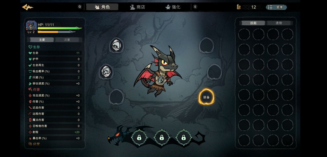养成都在局内进行,包括遗物、技能、龙威、符文几个部分。战胜波次可以选择遗物,有多种随机属性和随机品质。技能主要来源是商店,在巩固防御工事后,金钱可以在商店购买技能,然后二合一强化。龙威消耗角色升级所获得的点数来升级,等级提升后解锁格子,也是六个槽位,可以在商店中购买符文安装,增加搭配组合策略。