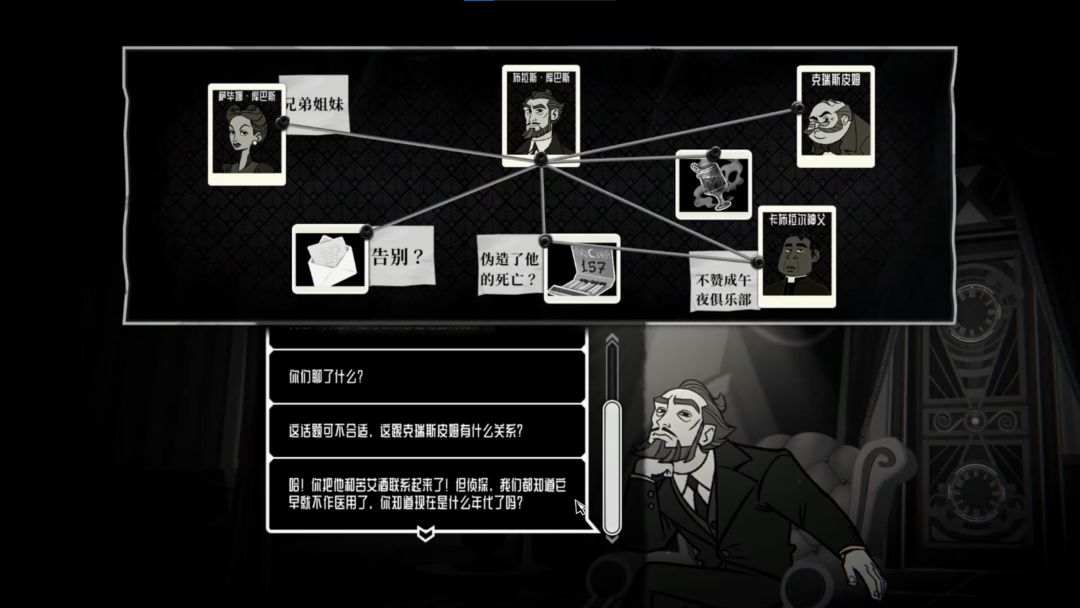 已经死亡的调查委托主布拉斯·库迪斯在我们每次死亡后都在阴阳交界等着我们。会评价我的调查行为和那些嫌疑人。还会给出一些对我的调查非常有用的提示。我挺喜欢他,有些俏皮的性格,当时对自己的死因和各种事情又闪烁其词。我们的一些讨论中还闪烁着一些有趣的哲学思考。