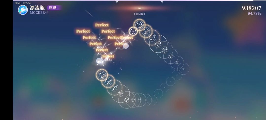 国风的画面,看上去还是不错的。并且大多数谱面都进行了艺术化设计,贴合曲子氛围主题,有些打起来个人感觉赏心悦目的,比如《漂流瓶》最后就直接点题,在谱面上画了一个漂流瓶。大多数曲子的音符设计应该是对应了乐器的演奏,我能明显感受到的是《灯影落》的拨弦,把打击音效调整好的话打起来感觉就是在弹奏乐器样的。不过有些曲子打起来要素比较多,看起来比较乱,有可能是我自身实力不够打不出来。
