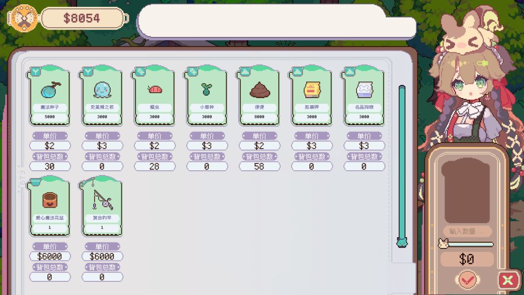 不是,空的花盆中还能种植出作物吗?游戏用一些特殊的魔法设定,来展现丰富的古挂机元素。前期我们就可以直接用泥土种植出彩虹星星和彩虹草,也可以直接不用鱼饵钓起素面鱼和铂金面鱼。这为我们的发展提供了最初始的资源,但等我们有了资金以后,就要开始花钱来获取更加珍贵的材料。