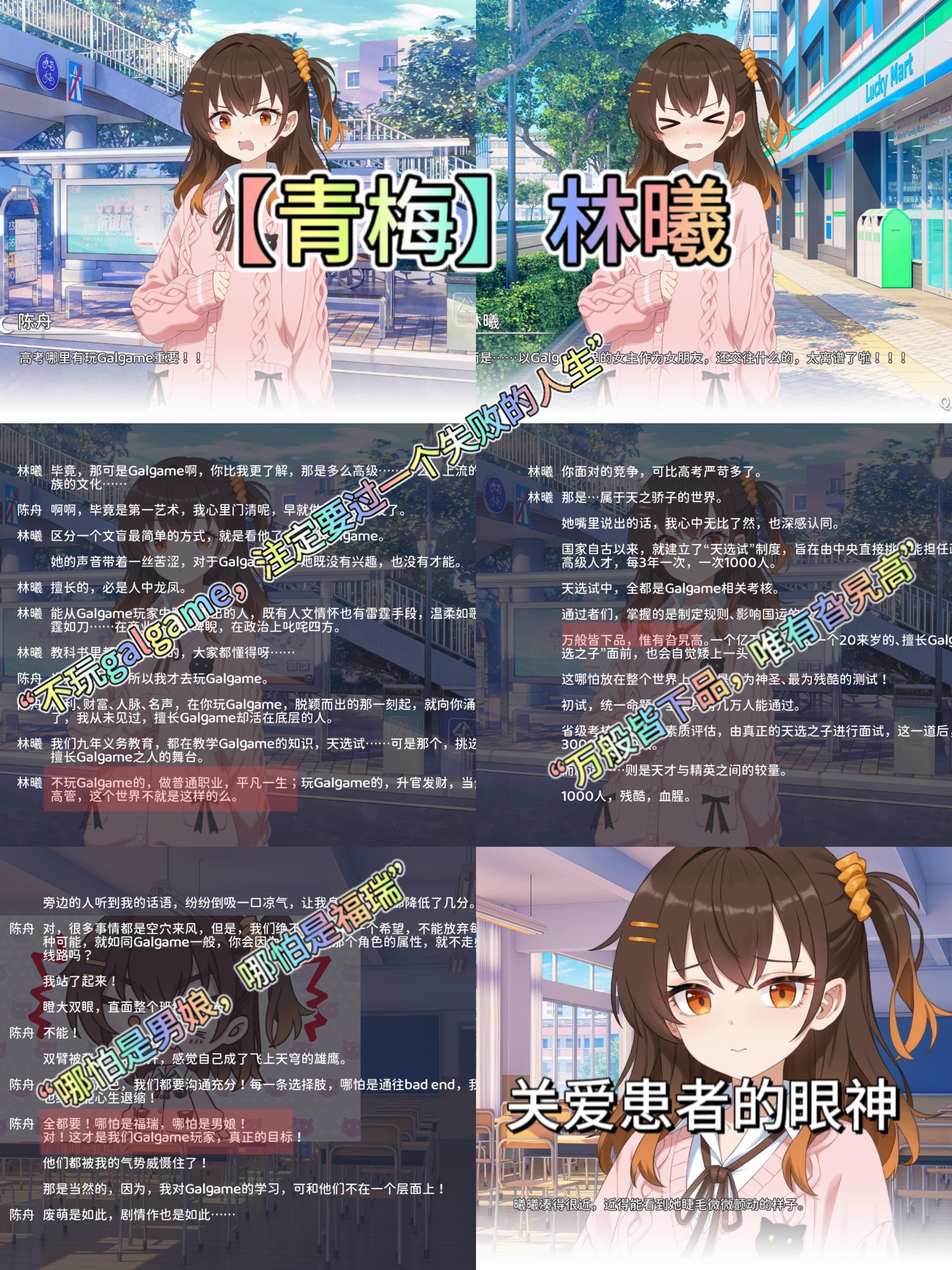 ✿「玖儿•咏唱起手」尊敬的各位玩家,欢迎游看本篇评价。您将会在本稿中看到以下内容:•青梅是兄弟也可以是败犬•天降是大神也可以是小三•幻想是成真也可以是游戏您将会在本游中看到以下内容:•galgame是贵族文化也是第一艺术•不玩galgame注定要过惨败的人生•galgame天选试比高考严苛多了•哪怕是福瑞!哪怕啊男娘!•我是galgame领域大神,分分钟攻略小处男•我要当他小三,从那虚拟女友手中ntr过来!•不就是小三,我也不是不行,你真是天才•玩到真结局好难过,这种galgame太坏了!•像是妹妹被做成了好多个礼物盒的•我只感觉自己脑髓快蒸发了,所以试玩结束•真不知道那些幻想另一个人说话怎么做到的❀——❀————————❀——❀✿注1.游戏目前体验到的仅仅是试玩版(即demo)2.游戏的世界观是独尊galgame外勉强正常的3.玖儿(本人)并非galgame高手4.本篇收益暂源于平台相关冷门新游池活动5.本篇共1.9k字,配有图文,感兴趣的master请务必选择性观看~6.由于游戏玩法特性,本篇评论难以做到无剧透描述,对此表示遗憾❀——❀▌青梅是兄弟也可以是败犬•开篇一段叽里咕噜的对话,没听懂。总之很快跳转场景,阳光明媚的早上和青梅一起上课,随着街上有人号召galgame,铺垫了个大概世界观,然后随着男主一声语不惊人死不休“高考哪有galgame重要”,正式进入游戏世界观主线。游戏里的青梅出场很早,性格也比较开朗,中配总感觉莫名耳熟,在玩家眼里是「铺垫世界观」的工具人,而在男主眼里却是“兄弟”,在天降眼里却是“败犬”,这可不是玖儿瞎说的,游戏里原文就是有这么称呼的。•▌天降是大神也可以是小三•天降属于中期出场,一出场就是气势碾压,各种强势buff叠满,直接就是galgame领域大神,而在这种galgame独尊的世界里,简直就是至高无上的天才女神,哪怕是亿万富翁在其面前也抬不起头,校长更是唯命是从。而在众星捧月之中,毫不意外的找上了男主,甚至当众询问男主有没有对象,这堪比告白的桥段,玖儿至少能面不改色的玩下去——毕竟,男主的思维也很逆天,有对象、但是那对象虚拟女友。后续对于天降的剧情发展,不能说是经典偶遇制造情节,只能说是脑回路异常离谱,天降嘲讽青梅后,还主动提出要做小三...看到这一句,玖儿整个人亚麻呆住了。真的...逆天啊逆天...甚至青梅还谢谢对方,说自己也要当小三??•▌幻想是成真也可以是游戏•虚拟女友,小涟,是男主可以感受到、体验到的虚拟角色,但是别人看不到,一开始玖儿还以为会是【沙耶之歌】那种男主认知出现偏差的情节,毕竟天降青梅也是这么说的,男主的认知可能有问题,但问题在于这虚拟角色、大伙都看不见摸不着的情况下,为啥男主能摸到还能有接吻情节?这到底是真的还是假的???不过关于这个虚拟角色的逆天之处,在于她陪男主打galgame,还能在一旁吹耳旁风,夸哪个角色可爱、就要好好走一条线下去。•▌其他方面•游戏能快进,在右上角;游戏能存档,在右下角。当然,就目前的demo版本没有分支来说,好像存档不存档都没什么区别,而且你为什么没有图鉴?galgame里没有图鉴,就缺失了最为重要的纪念一环,就像moba游戏里没有了MVP,二游活动没有了周年福利,使命召唤里没有了高光回放(好像这个可以没有)。•最后说一下配音问题,中配可以理解,尽管玩gal还是日配听得多,但是本作青梅的中配莫名有点出戏,男主则没有配音。•▌说一些心里话当然,可能作为galgame这样设计很好,但...玖儿可能还是比较理性,对一些存在逻辑上的问题,实属不吐不快:【青梅-林曦】“区分一个文盲最简单的方式,在于他玩了多少款galgame”,所以林曦亲口说出来的话,和后续与同学讨论中,憋不出galgame名字,最后急着说出几款被周围人哄堂大笑的废萌gal,这两真的是同一个人吗??₍ᐢ..ᐢ₎♡•【天降-江晚晴】“作为一个galgame领域大神,光在外面走一走,分分钟就能攻略十个八个小处男,拿下一个陈舟不是得心应手吗”青梅:那方法是?“我要当他的小三,把他从那个莫名其妙的虚拟女友手中NTR过来!”哇,还有牛!甚至是天降亲自去牛。所以——天降:“我一个galgame领域大神,身为天降攻略不下来,你陪我一起去当小三”青梅:“啊?我也要去吗?”天降:“是的,而且如果他不答应,你就和我一起,让他感受下什么叫做女生的青春曼妙”青梅:“啊?我也要去吗?”青梅:“不就是当小三...我也不是不行”•【虚拟女友-小涟】“真不知道那些幻想出来另一个人在自己身边说话是怎么做到的?”是的,没错,男主幻想的虚拟女友,亲口说的这么一句话,不亚于玩王者打龙坑团团灭、四个队友蒸发,你无奈顺着下路线去偷水晶准备一波时,队友问候一句“你不参团去偷家干嘛”。•▌看到这~恭喜您看完了,点个赞和关注吧!您的支持对玖儿非常重要!
