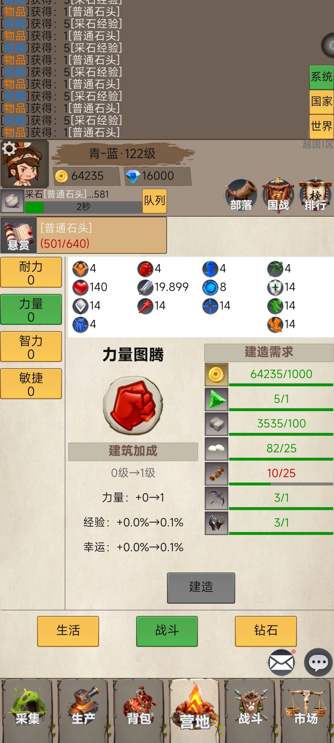 可以挂机的模拟部落人生的游戏,可以采集资源,生产物品,也可以自由交易,建造营地,还可以防守妖灵之地,远征国战,值得一试!